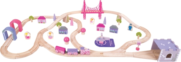 Diese Eisenbahn ist ideal für Kinder, die märchenhafte und prinzessinnenhafte Themen lieben. Das Set besteht aus 75 Teilen, darunter Brücken, Tunnel, Häuser und Bäume, die es den Kindern ermöglichen, ihre eigene magische Welt zu erschaffen.