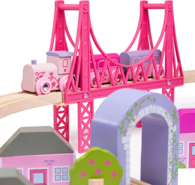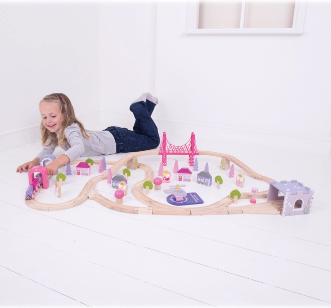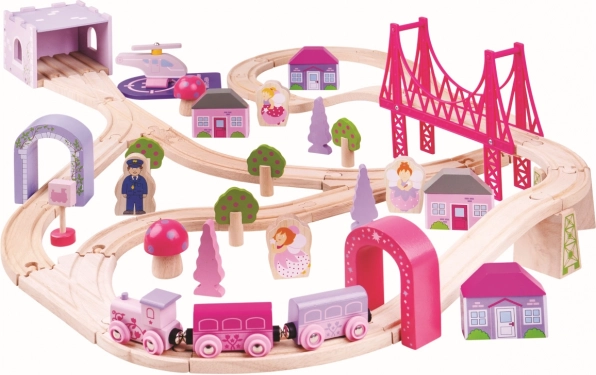 Diese originelle hölzerne Eisenbahn der Prinzessinnen bietet schöne rosa und lila Töne und 75 Zubehörteile für kleine Mädchen. Fördert die Vorstellungskraft und entwickelt die Motorik Ihrer Kinder.
