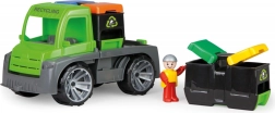 Zum Set gehören zwei spezielle Container mit Sicherung gegen unfreiwillige Trennung vom LKW. Jeder Container hat ein abklappbares Oberteil und einen unteren Auslass, was interaktives Spielen beim Sortieren von Abfällen ermöglicht. Die aktive Figur verstärkt das Spielerlebnis zusätzlich und lehrt die Kinder die Komplexität des Umgangs mit Abfällen.