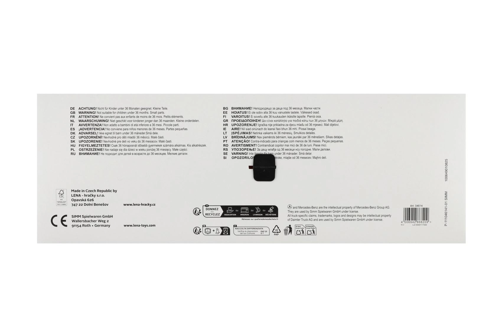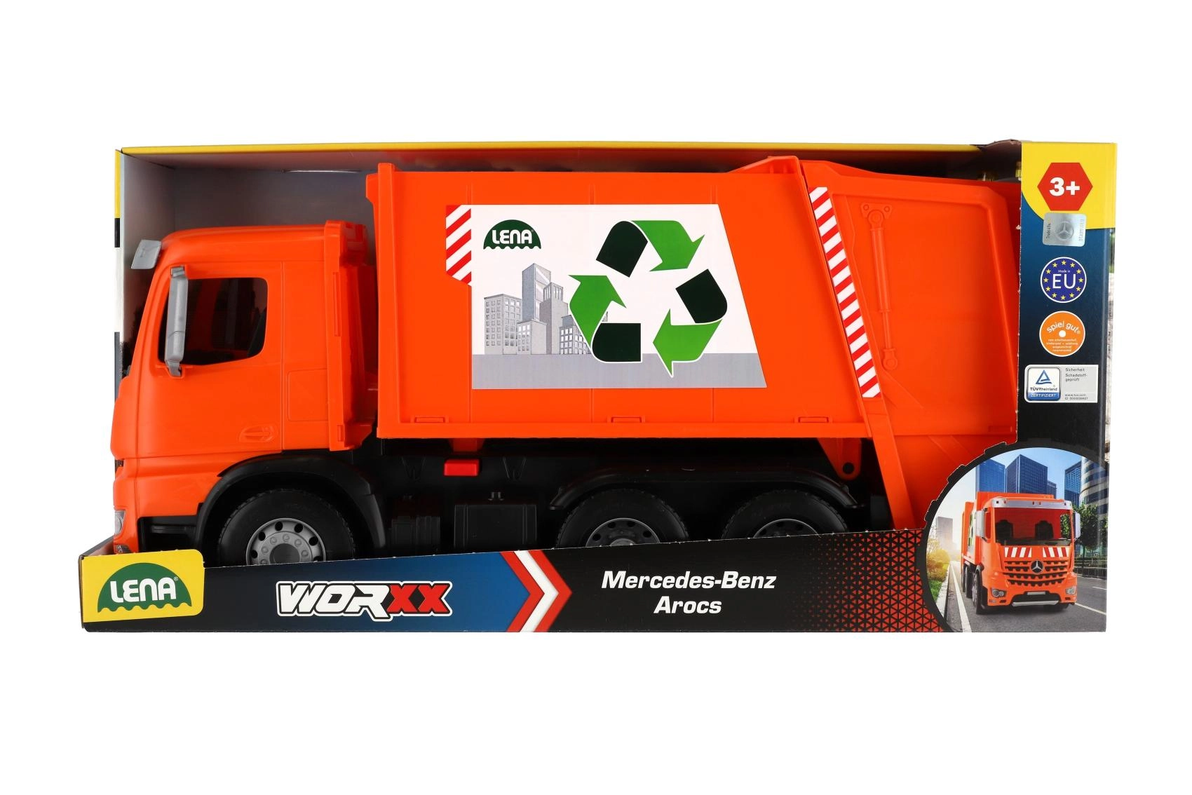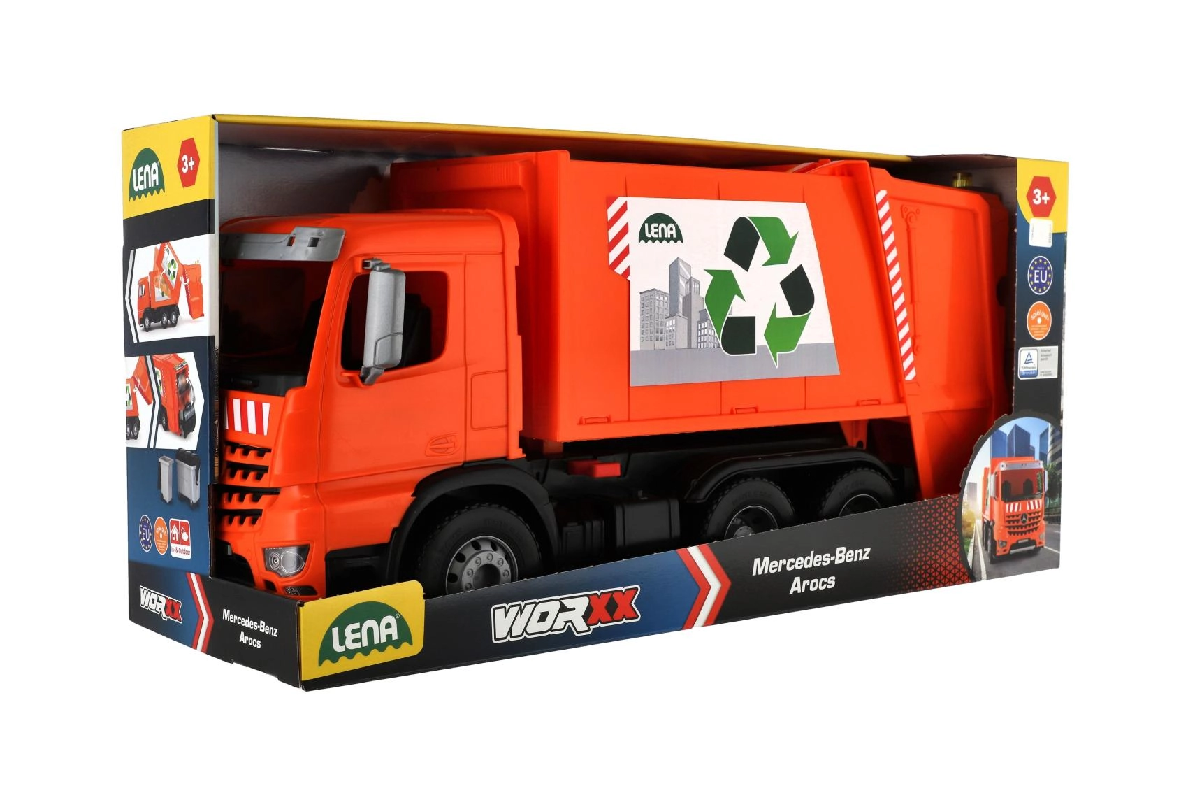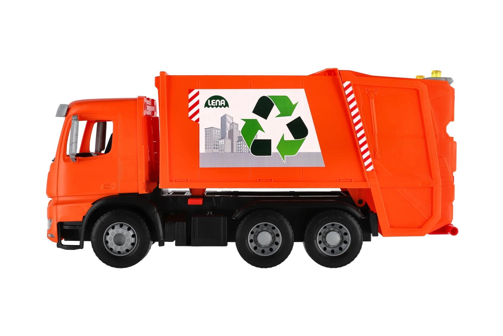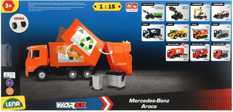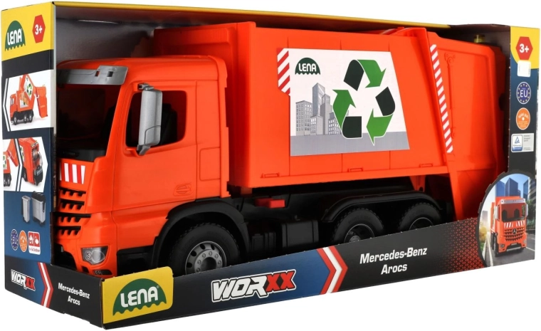 Der Müllwagen MERCEDES AROCS von LENA ist ein detailreich gestaltetes Fahrzeug für kleine Technikfans. Dank der robusten Ausführung aus hochwertigem, widerstandsfähigem Kunststoff und den stabilen Metallachsen der Räder meistert er den täglichen Einsatz drinnen wie draußen. Das funktionale Heck mit Sicherung ermöglicht ein sicheres Beladen und Auskippen des Abfalls.