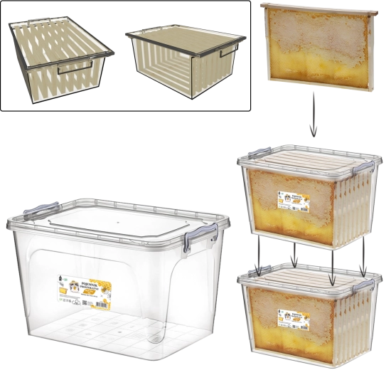 Die rechteckige Multi-Box 30 l ist für den ganzjährigen Einsatz einschließlich der Winterzeit konzipiert. Spezielle Innenleisten halten die Waben so, dass sie nicht an den Wänden anliegen und sauber sowie unbeschädigt bleiben. Ein dicht schließender Deckel verhindert effektiv das Eindringen der Wachsmotte und kleiner Nagetiere, während die transparenten Wände eine schnelle Sichtkontrolle ohne Öffnen ermöglichen.
