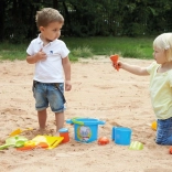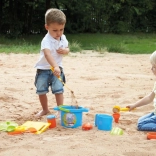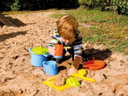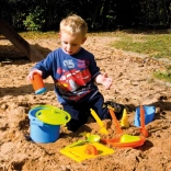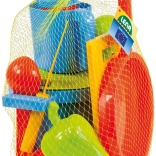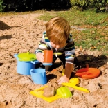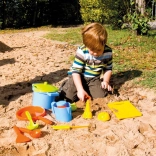 Das Set umfasst alles, was Kinder für ein Sandbankett brauchen: vom Topf mit Siebdeckel über Pfännchen, Kännchen und Zuckerdose bis hin zu Schöpflöffeln und Förmchen in Form von Gemüse und Eiswaffeln. Robuster Kunststoff und die Netzverpackung erleichtern Transport und Aufbewahrung.