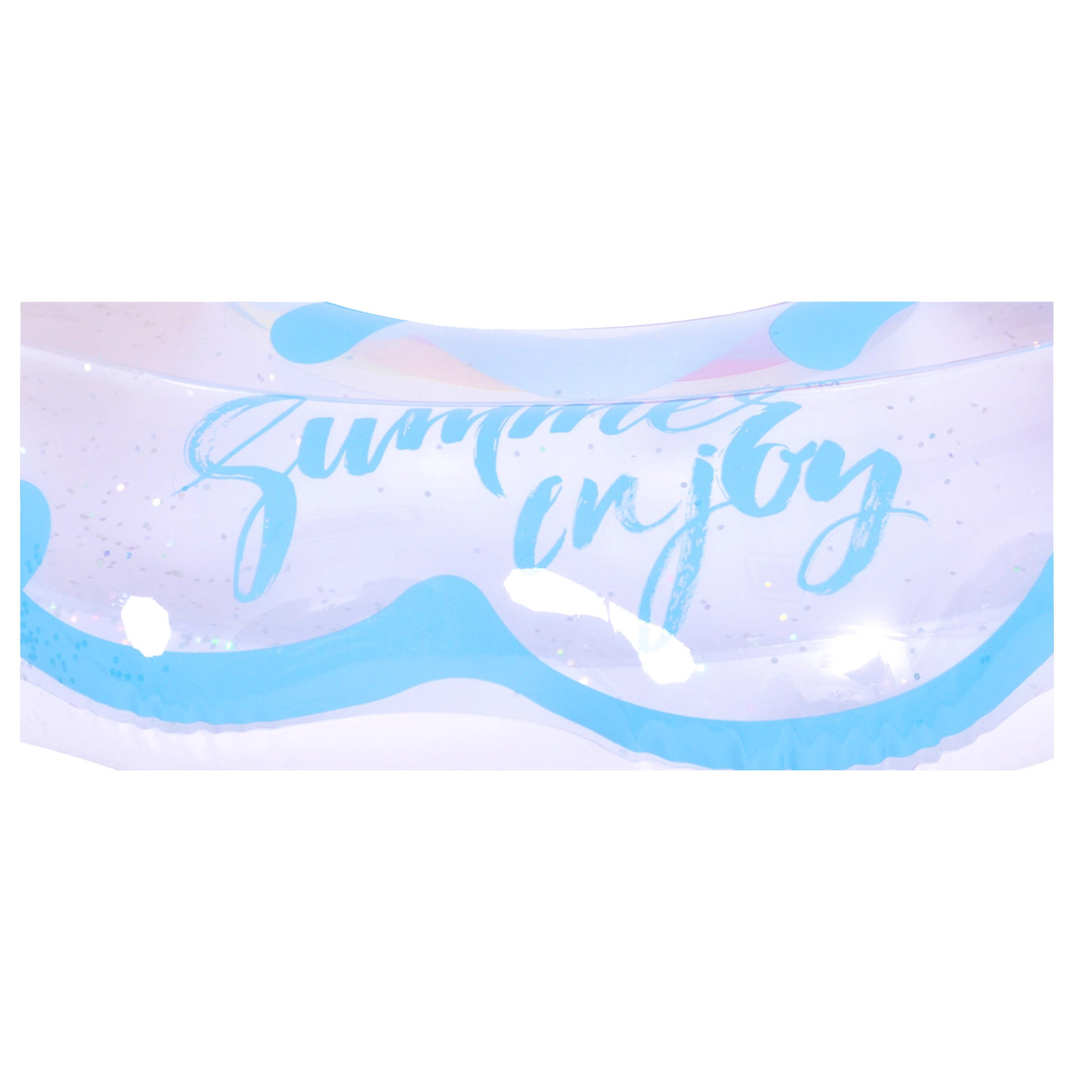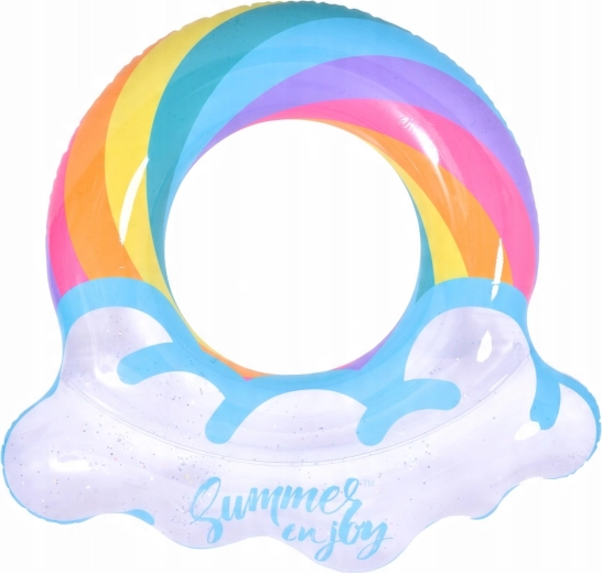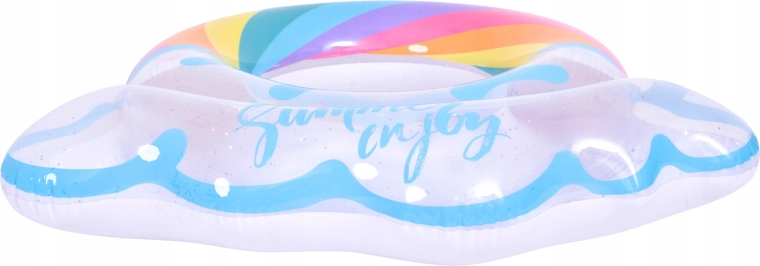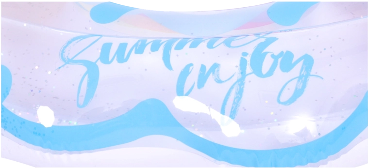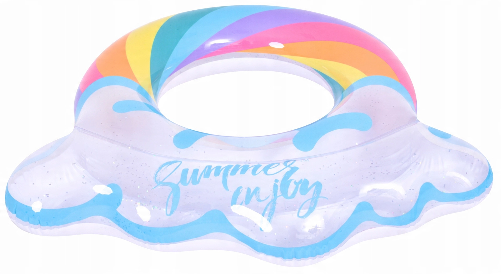 Genieße den Sommer in vollen Zügen mit diesem stylischen aufblasbaren Ring in Regenbogenform. Das transparente Design mit blauen Akzenten und glänzenden Glitzerpartikeln verleiht dem Wasserspaß extra Pepp. Ideal für Pool und Meer, gefertigt aus robustem Vinyl für lange Haltbarkeit sowie sicheres Schwimmen und Entspannen. Der große Durchmesser von 106,5 × 103 cm sorgt für Komfort für Teenager und Erwachsene 12+.