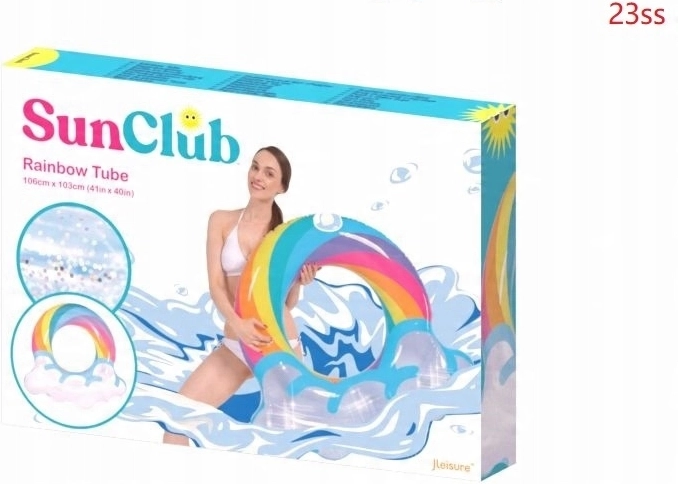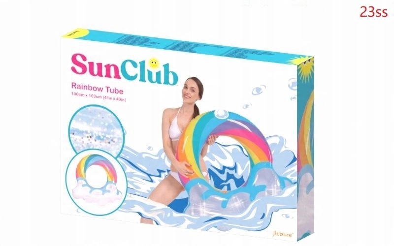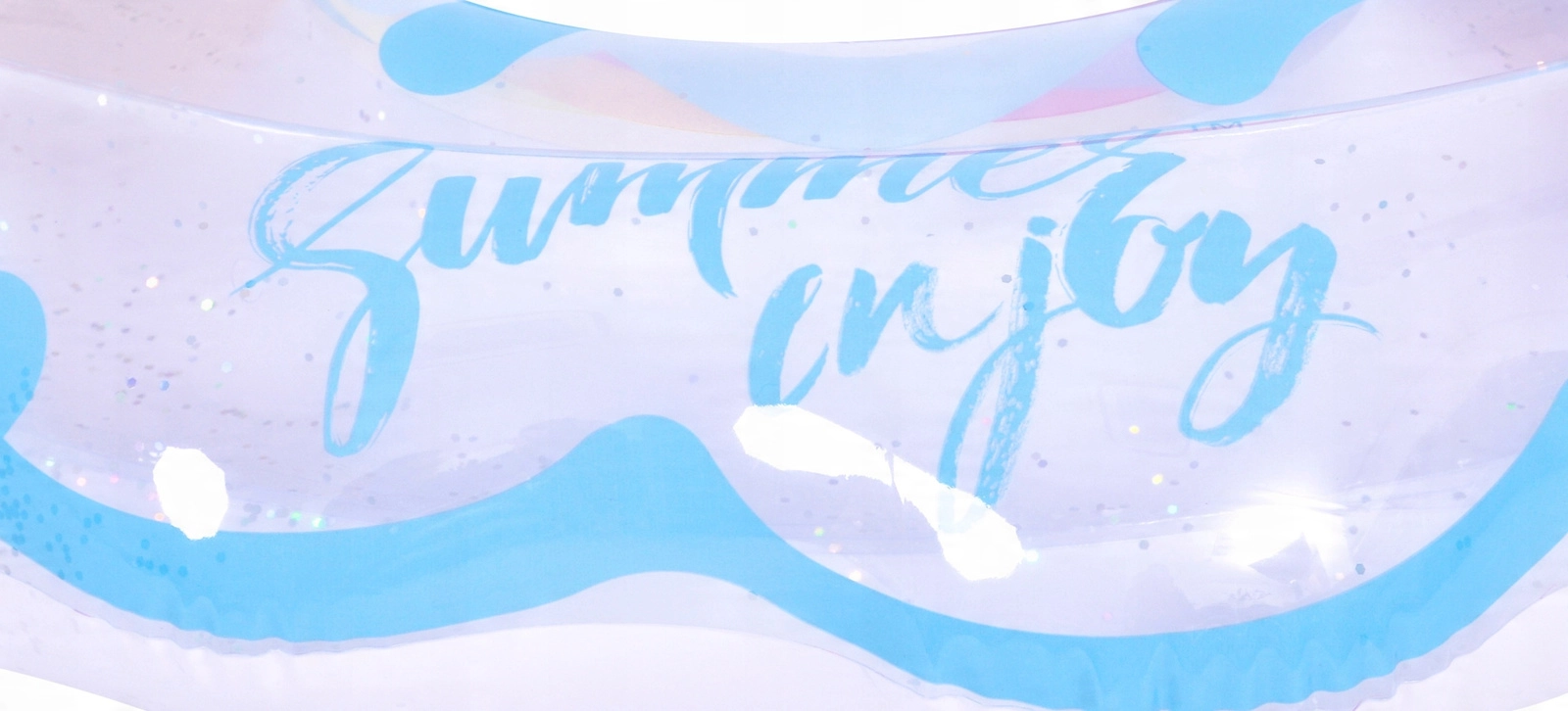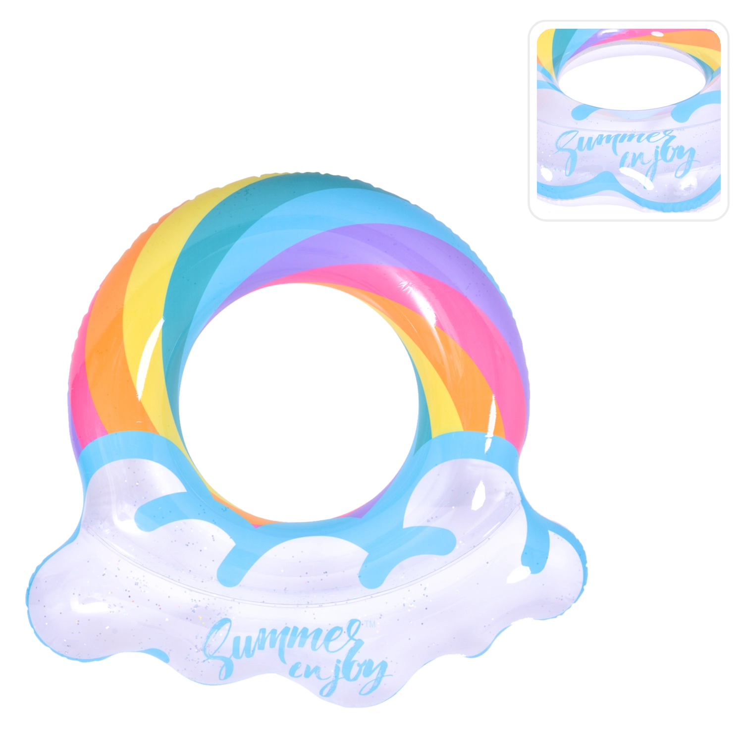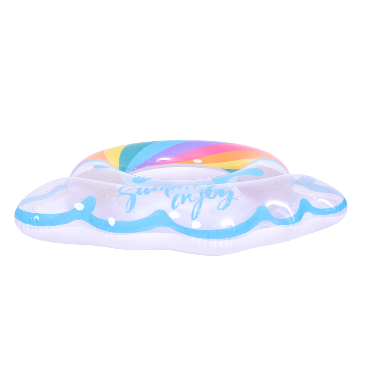 Genieße den Sommer in vollen Zügen mit diesem stylischen aufblasbaren Ring in Regenbogenform. Das transparente Design mit blauen Akzenten und glänzenden Glitzerpartikeln verleiht dem Wasserspaß extra Pepp. Ideal für Pool und Meer, gefertigt aus robustem Vinyl für lange Haltbarkeit sowie sicheres Schwimmen und Entspannen. Der große Durchmesser von 106,5 × 103 cm sorgt für Komfort für Teenager und Erwachsene 12+.