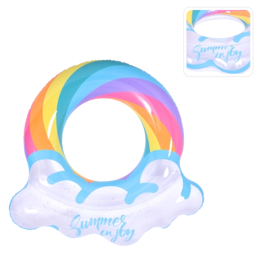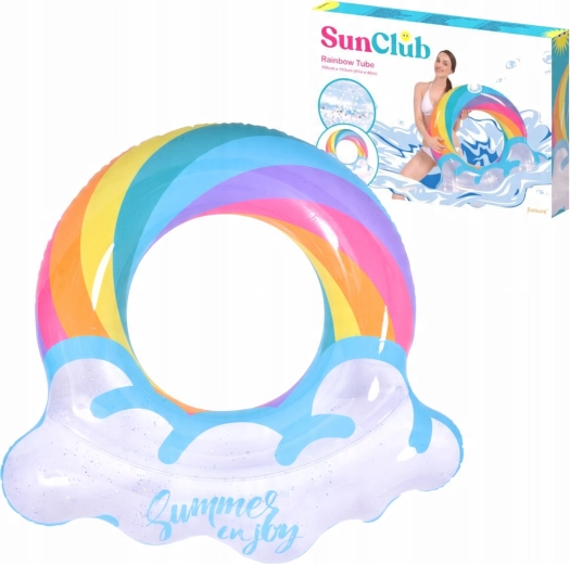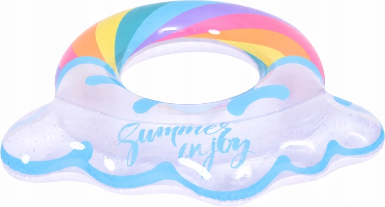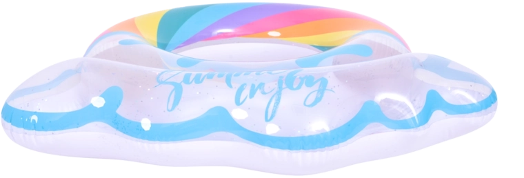 Der aufblasbare Ring mit Regenbogenmotiv und wolkenartigen Rändern ist der perfekte Begleiter für sommerlichen Spaß. Der transparente Körper mit farbigen Streifen und glitzernden Partikeln sorgt für beste Sichtbarkeit auf dem Wasser und macht auf jedem Foto eine gute Figur. Dank der stabilen Vinylkonstruktion ist der Ring widerstandsfähig gegen Abrieb und normale Abnutzung.