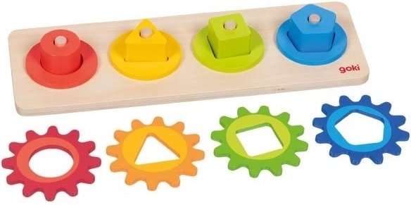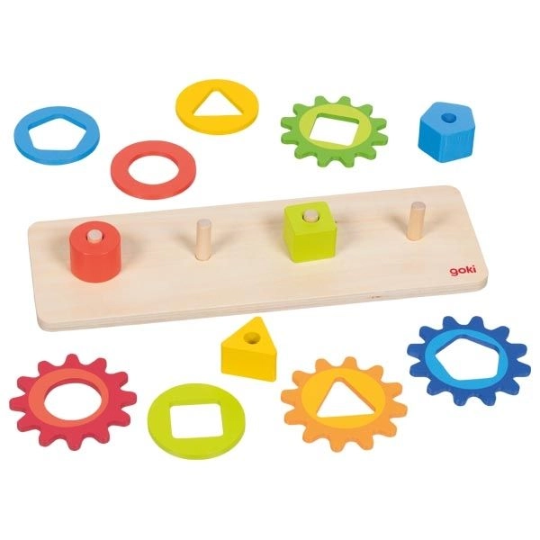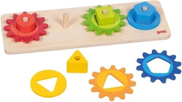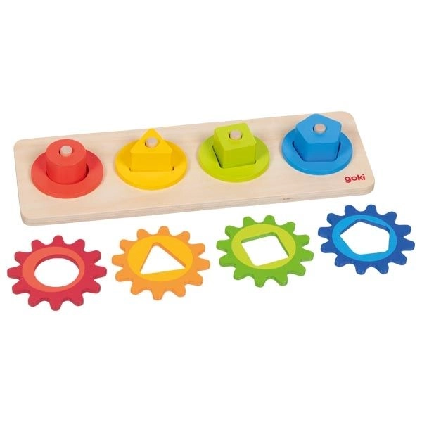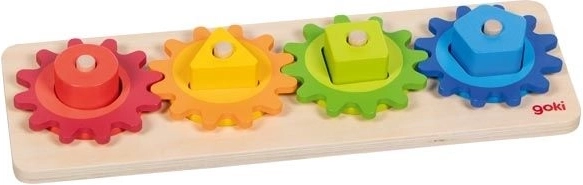Dieses motorische Holzspielzeug kombiniert das Einsetzen und Sortieren farbiger Formen mit dem Drehen verbundener Zahnräder. Beim Spielen entdecken Kinder ganz natürlich das Prinzip von Ursache und Wirkung – sie drehen an einem Rädchen und die anderen setzen sich in Bewegung. Auf spielerische Weise fördern sie so Geschicklichkeit, Geduld und räumliches Vorstellungsvermögen.