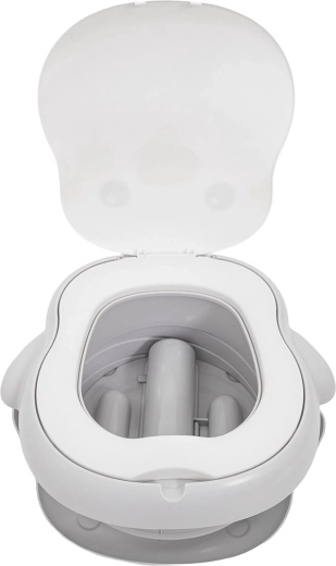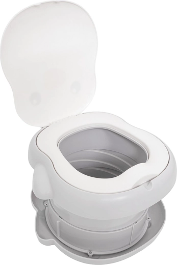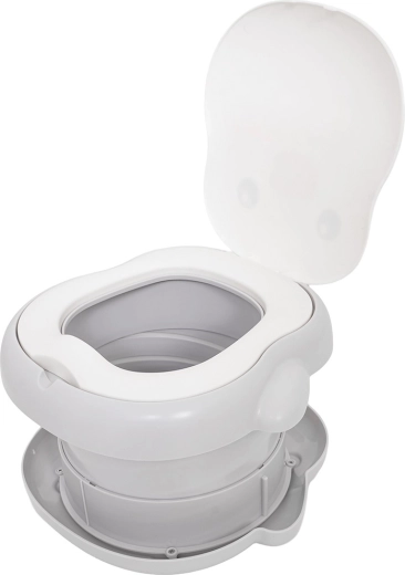 Kompaktes und hygienisches Reise-Töpfchen für Kinder mit schnellem Auf- und Zuklappen, leichter Reinigung und rutschfester Basis. Inklusive Rolle mit Einwegbeuteln und Stauraum im Boden des Töpfchens, plus Transporttasche. Ideale Lösung für Reisen und Ausflüge, minimiert Stress in Notsituationen.