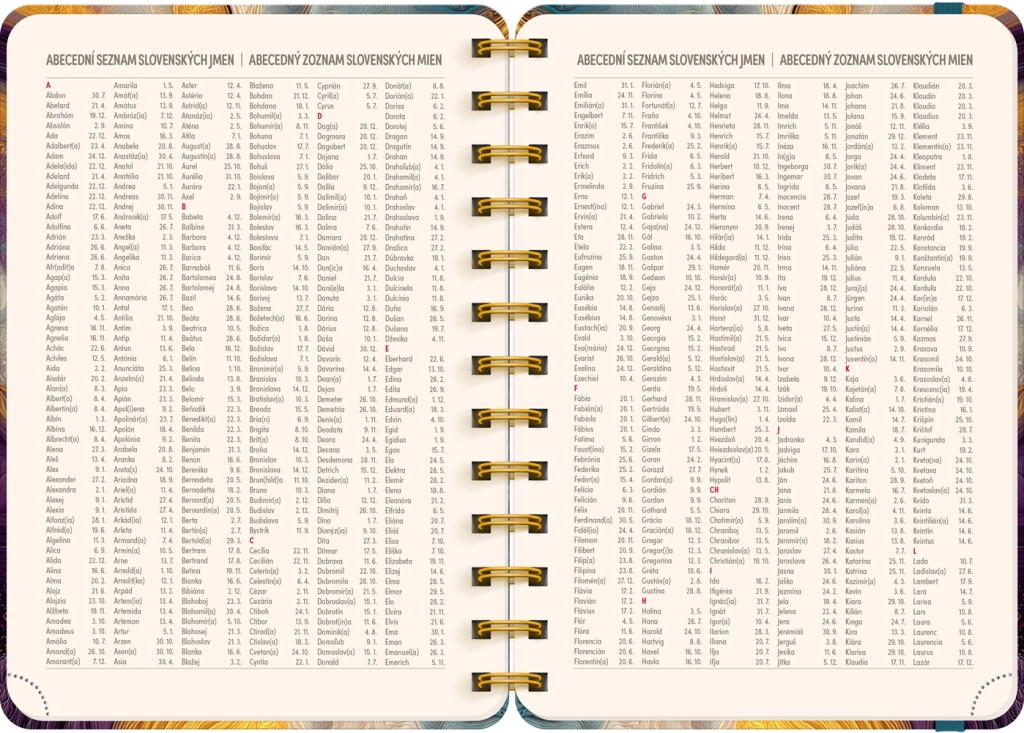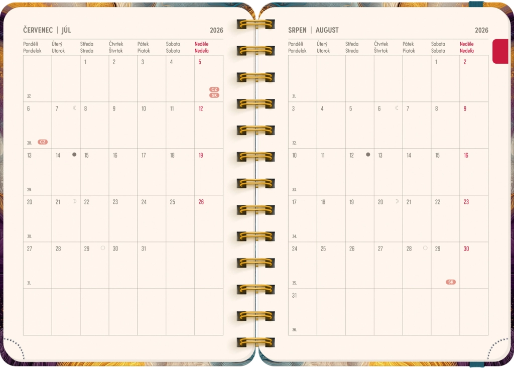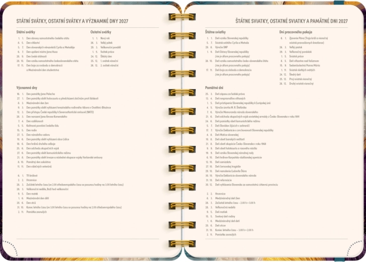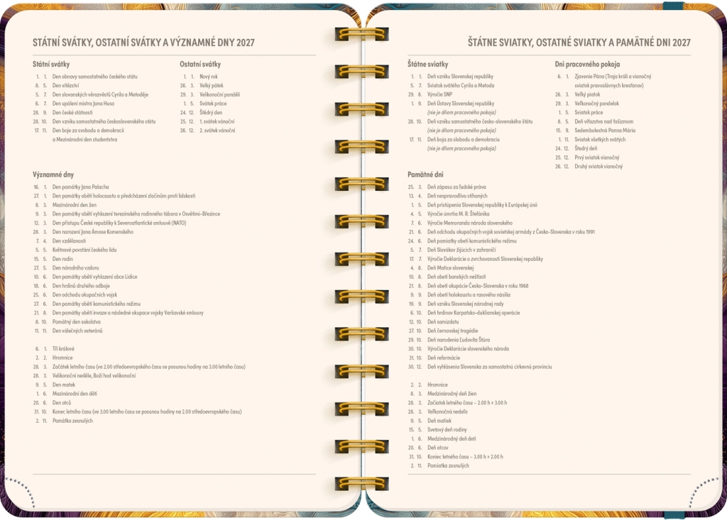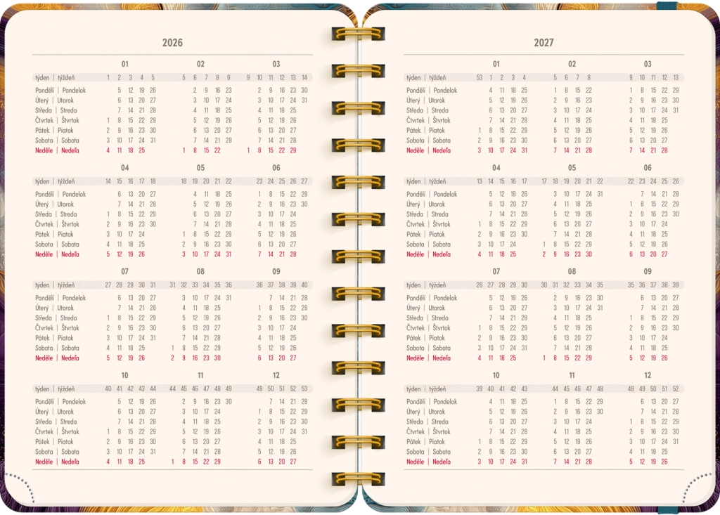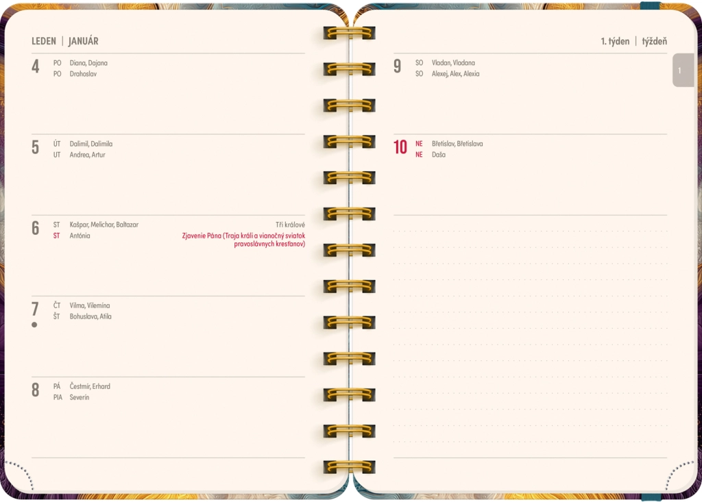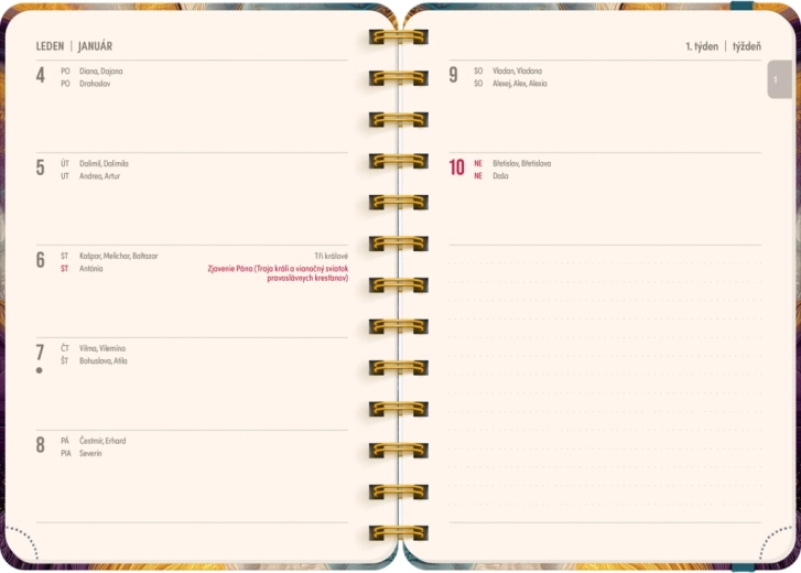 Das Kalendarium ist tschechisch‑slowakisch, übersichtlich und mit Namenslisten ergänzt, sodass Sie Feiertage und Namen stets zur Hand haben. Jede Woche enthält einen ausgewiesenen Platz für Notizen, damit Sie Prioritäten, Aufgaben und wichtige Termine festhalten können.