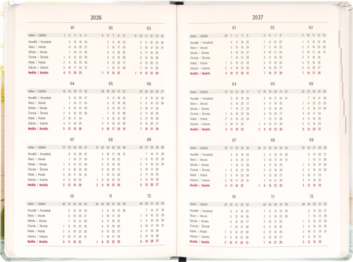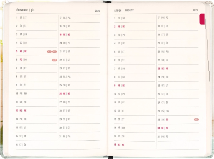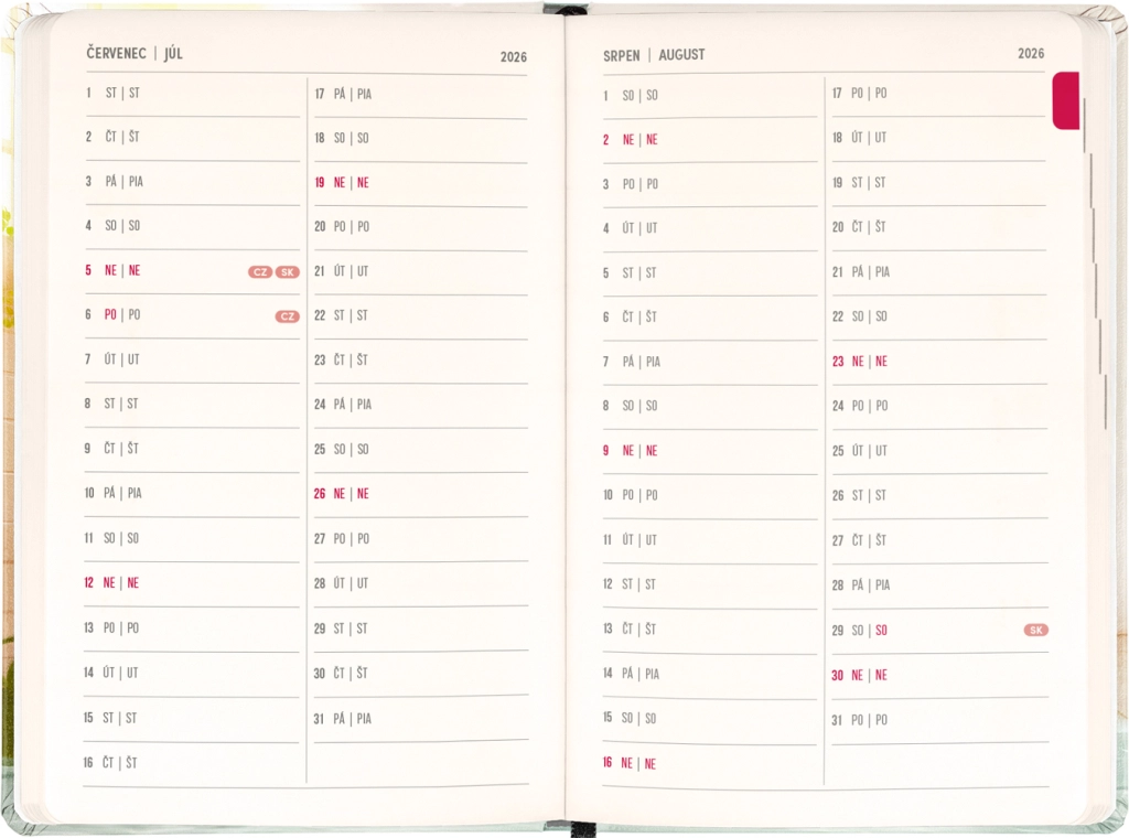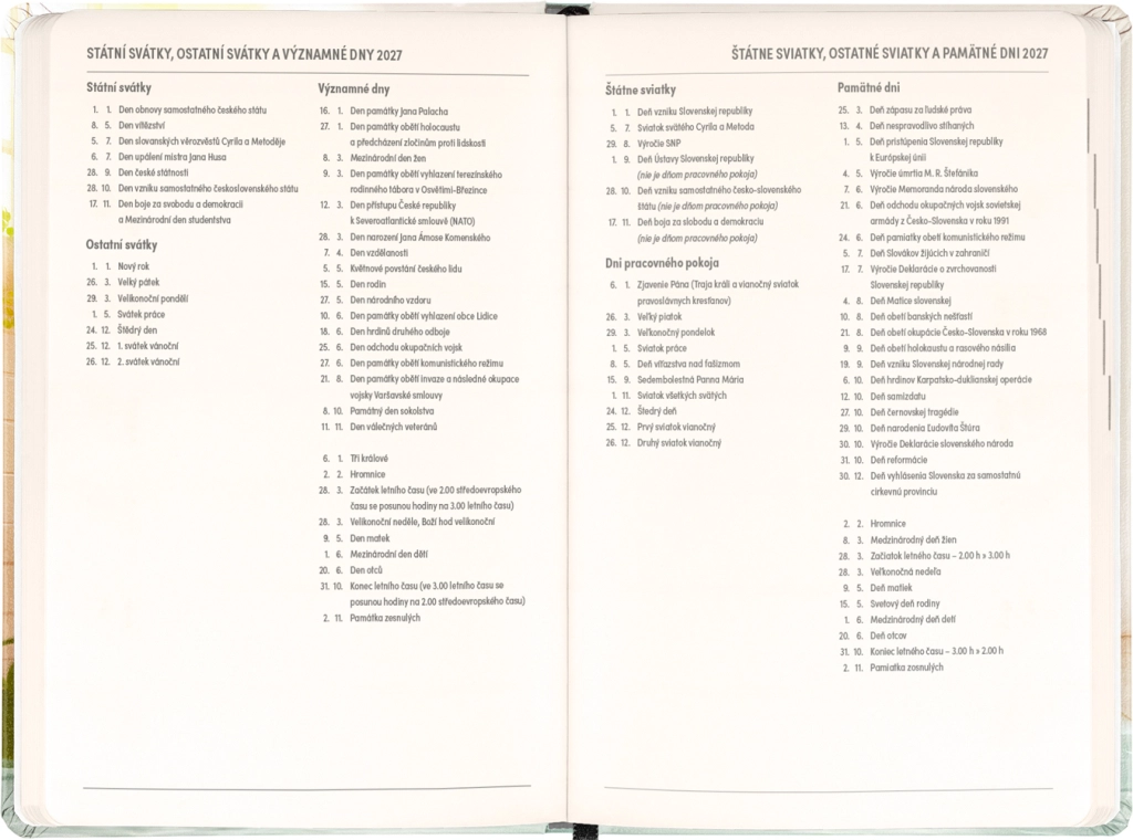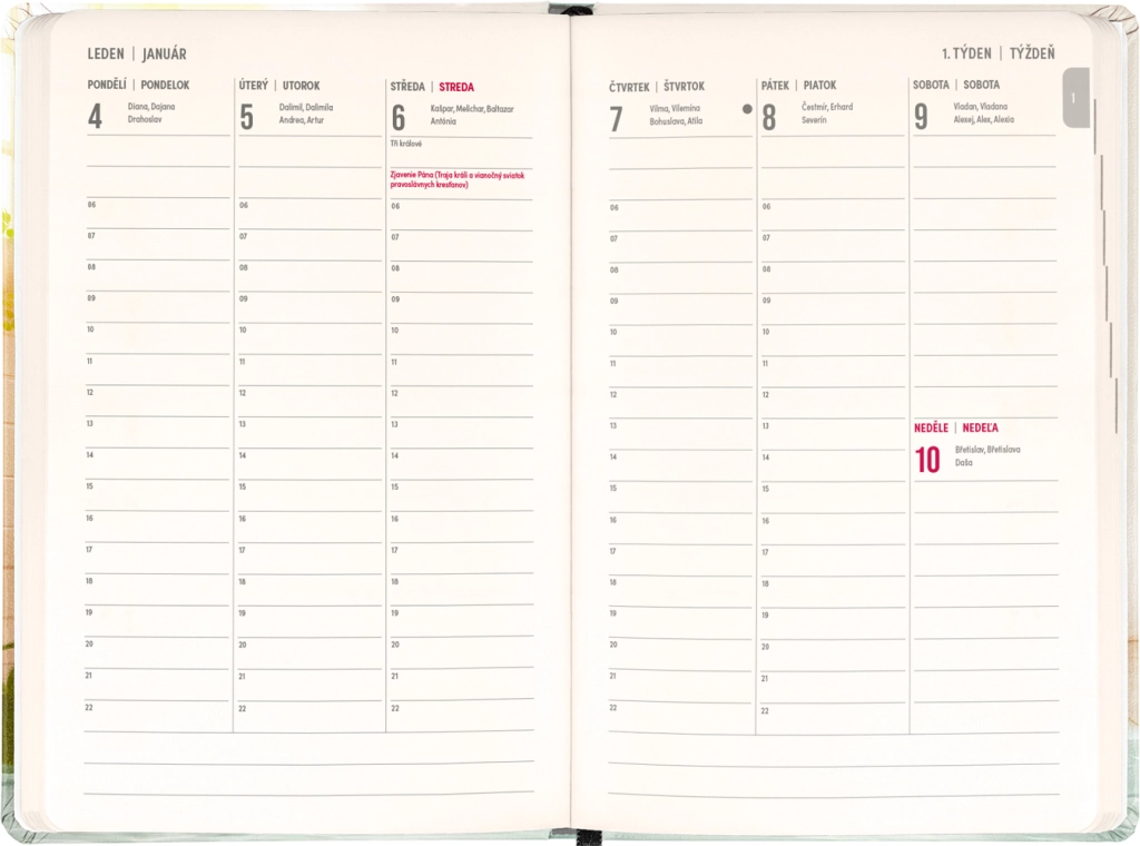 Der Planer erfreut alle, die eine Kombination aus Funktionalität und verspieltem Design schätzen. Das tschechisch‑slowakische Kalendarium mit Namen und Feiertagen erleichtert die Planung und hilft, besondere Tage nicht zu vergessen.