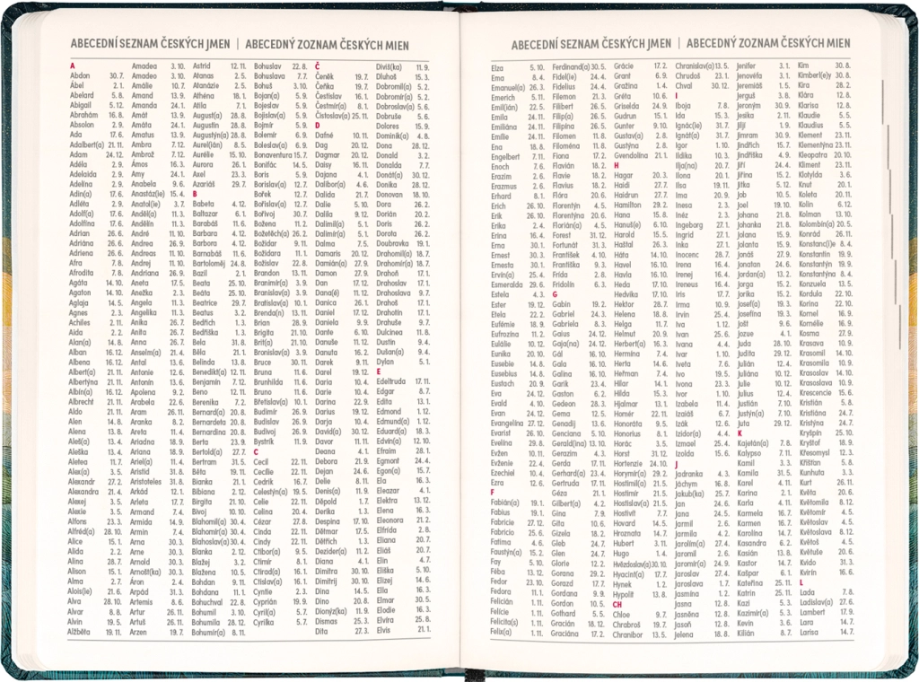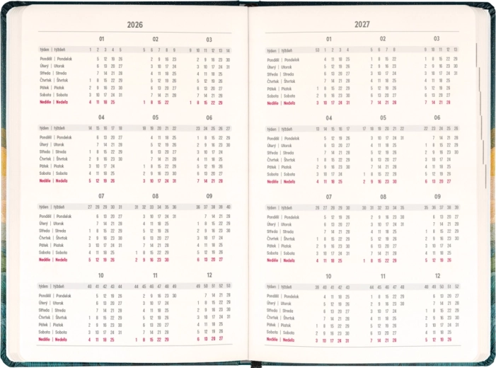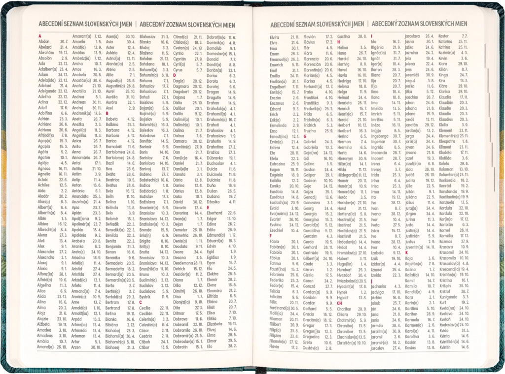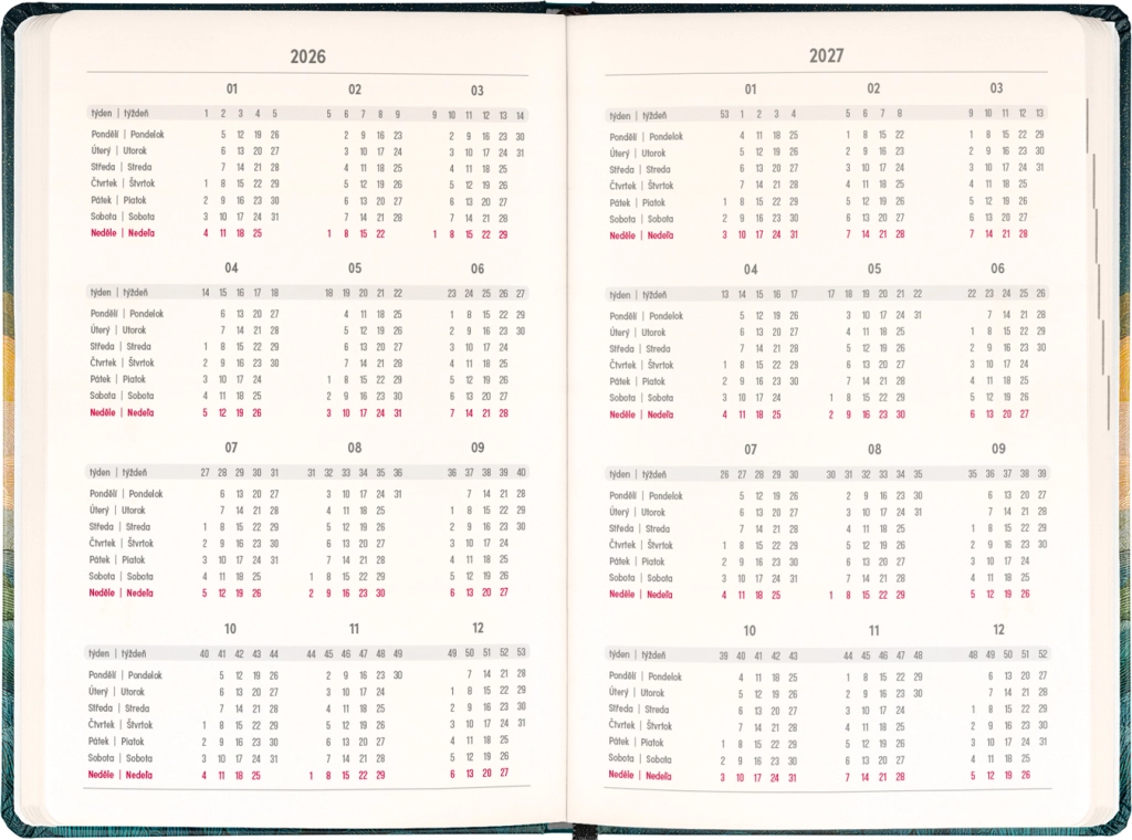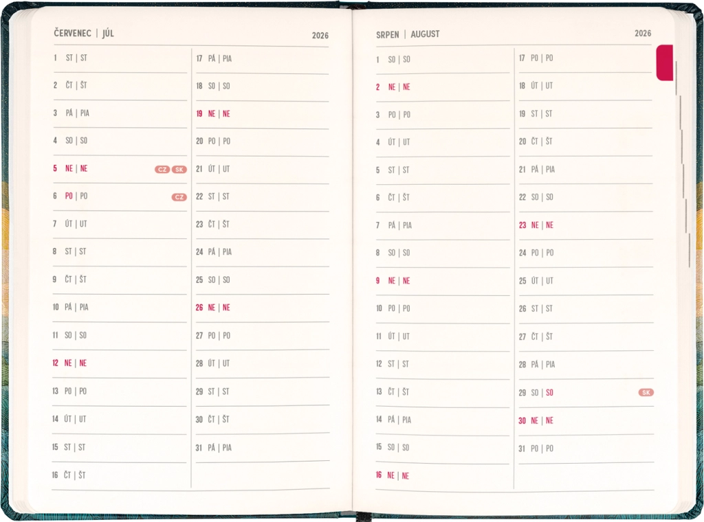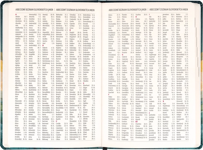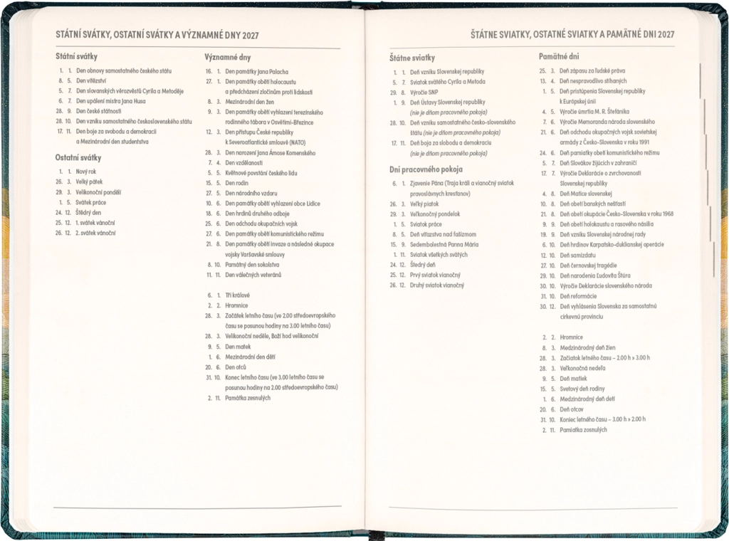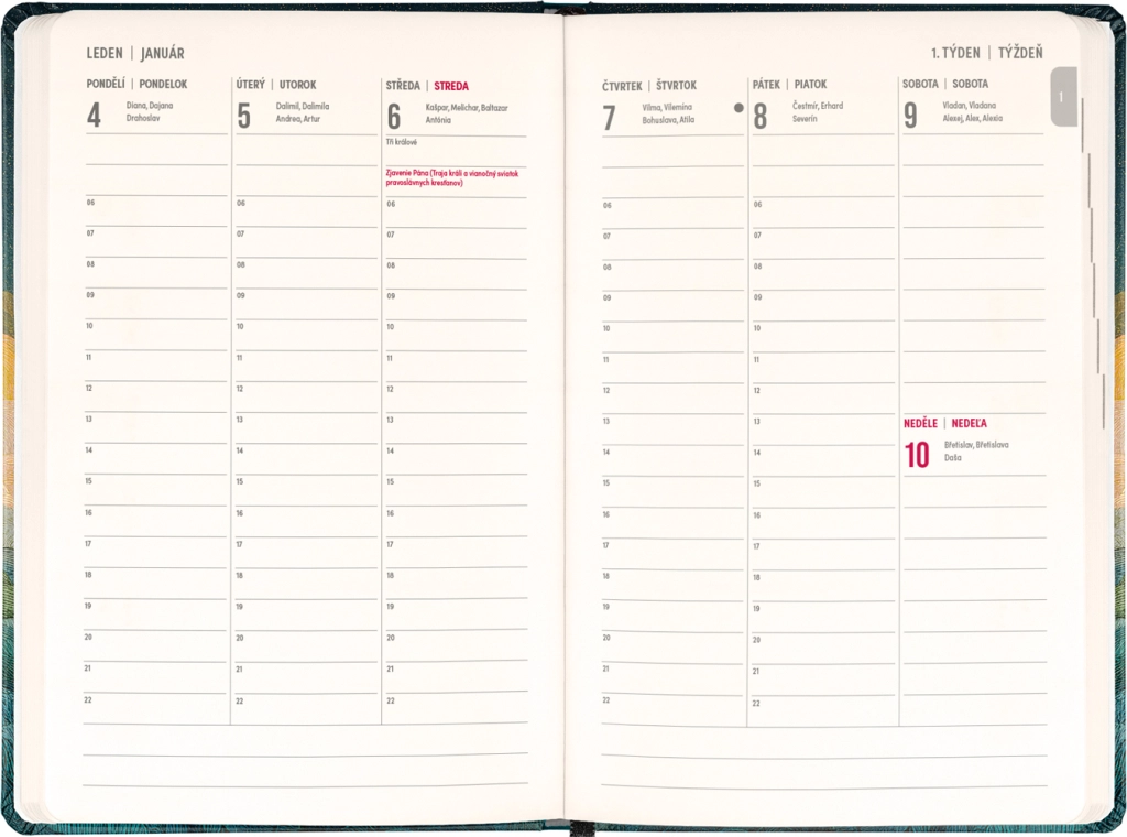 Das wöchentliche Spalten‑Layout im tschechisch‑slowakischen Kalendarium ermöglicht schnelles Eintragen von Aufgaben, Terminen und Meetings. Enthalten sind außerdem ein Verzeichnis tschechischer und slowakischer Namen sowie gekennzeichnete Feiertage, damit Sie stets den Überblick behalten.