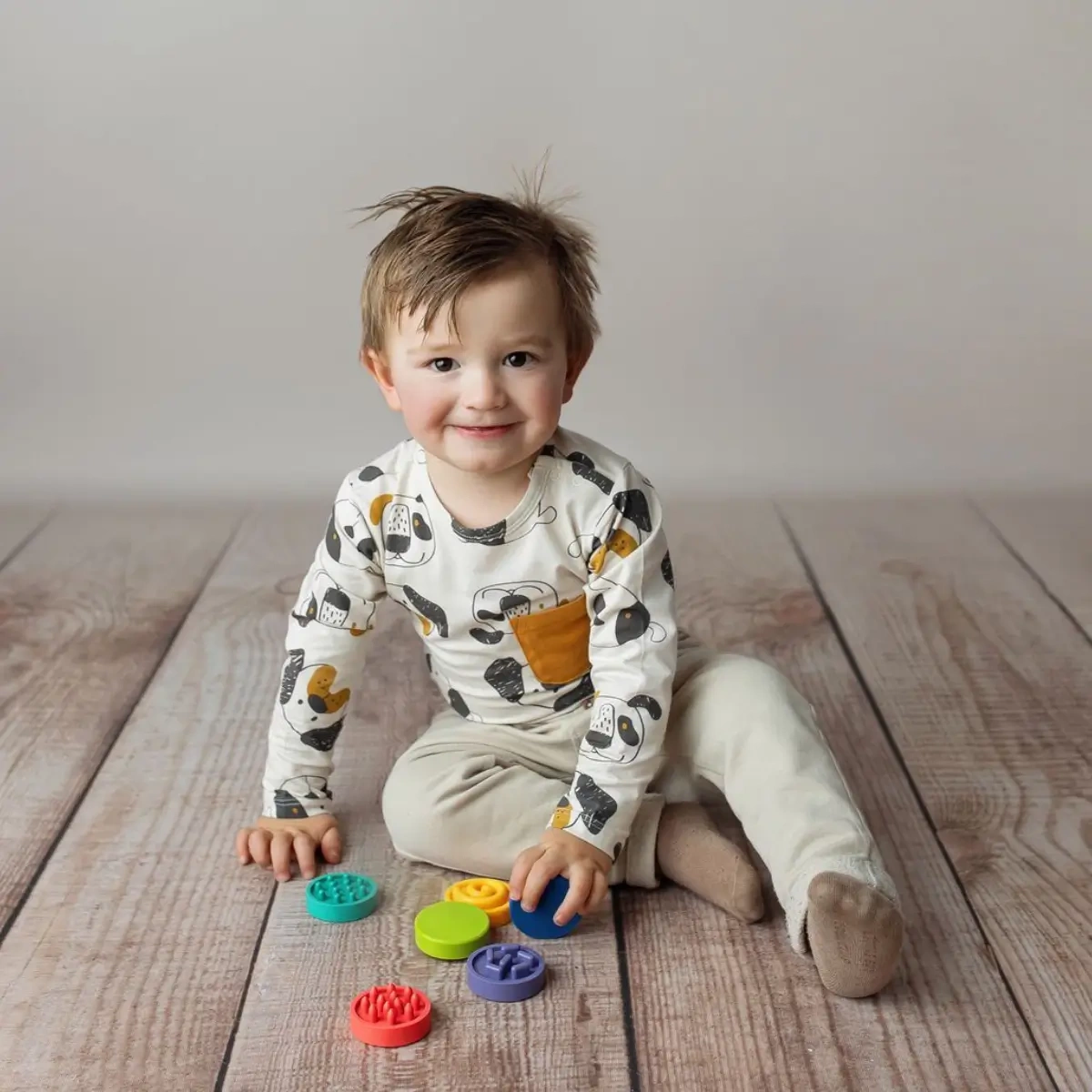 Bunte Scheiben mit unterschiedlichen Oberflächen unterstützen das Erkennen von Texturen, Farben und Formen. Kinder stärken spielerisch ihr Tastsinn-Erleben und die Konzentration.