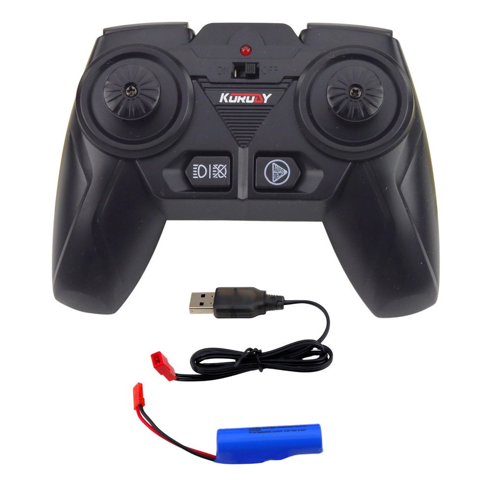 Die kabellose Steuerung auf 2,4-GHz-Frequenz sorgt für eine stabile, störungsfreie Verbindung, die LED-Beleuchtung verleiht dem Modell auch bei schwächerem Licht ein realistisches Erscheinungsbild und die Gummireifen sorgen für sicheren Grip auf unterschiedlichen Oberflächen. Die Akkubetriebene Stromversorgung reduziert den Bedarf an häufigem Batteriewechsel und erhöht den Spielkomfort.