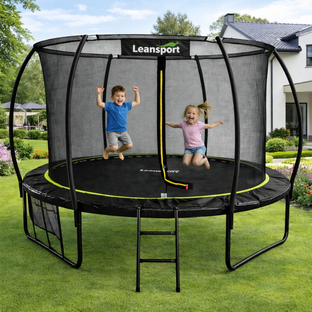 Das LEAN Trampolin 305 cm ist die ideale Wahl für Kinder und Erwachsene. Das hohe, innenliegende Sicherheitsnetz mit verschließbarem Einstieg verhindert das Herausfallen, während der robuste Rahmen aus verzinktem Stahl Korrosion und intensiver Nutzung standhält. Ein breiter Schutzrand aus PVC/PE bedeckt die Federn und erhöht die Sicherheit bei jedem Sprung.