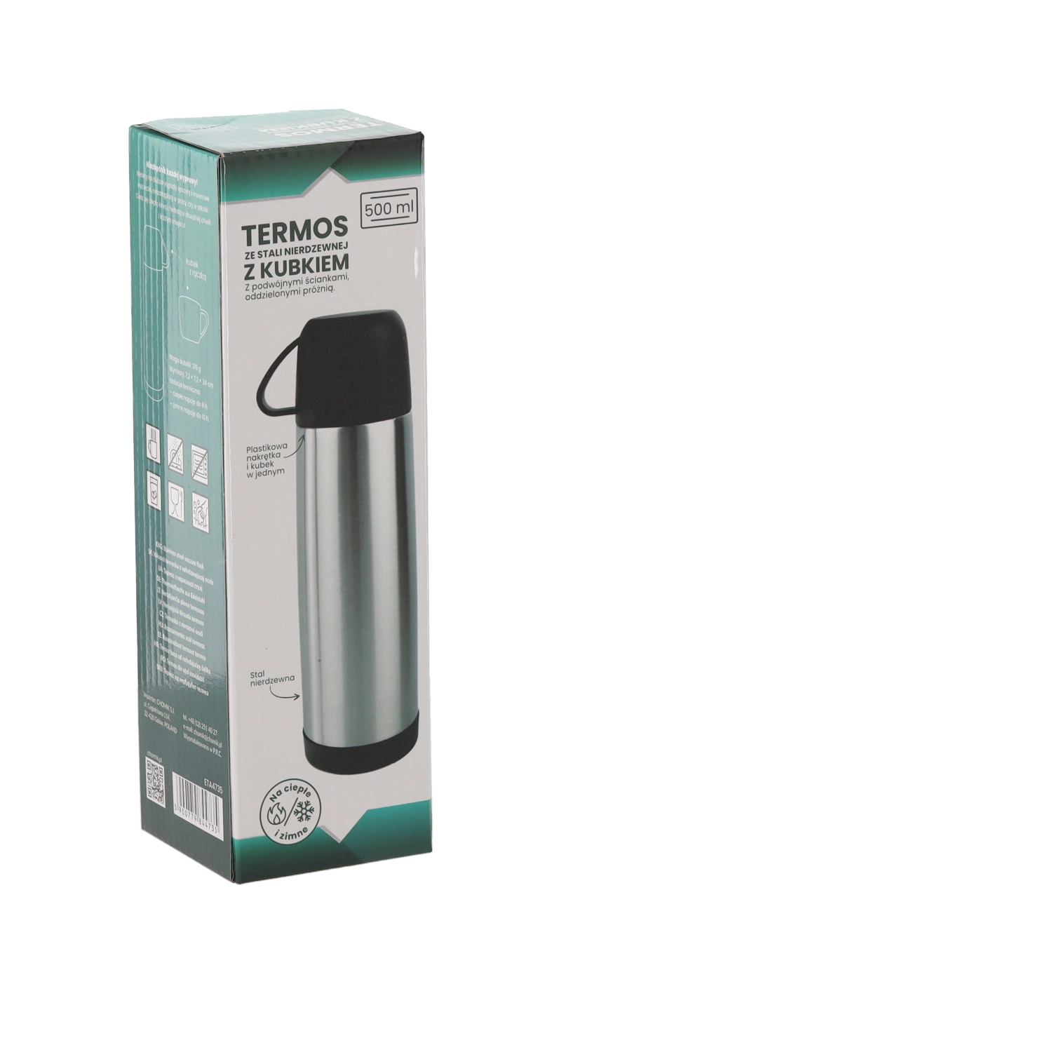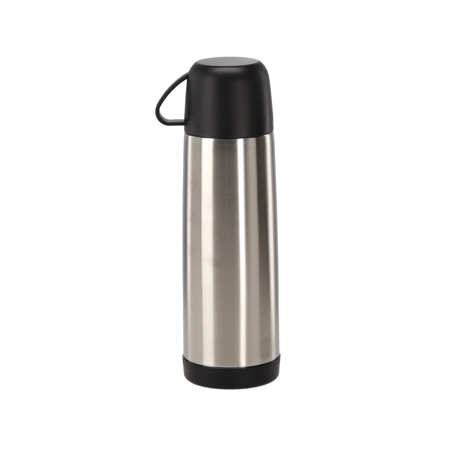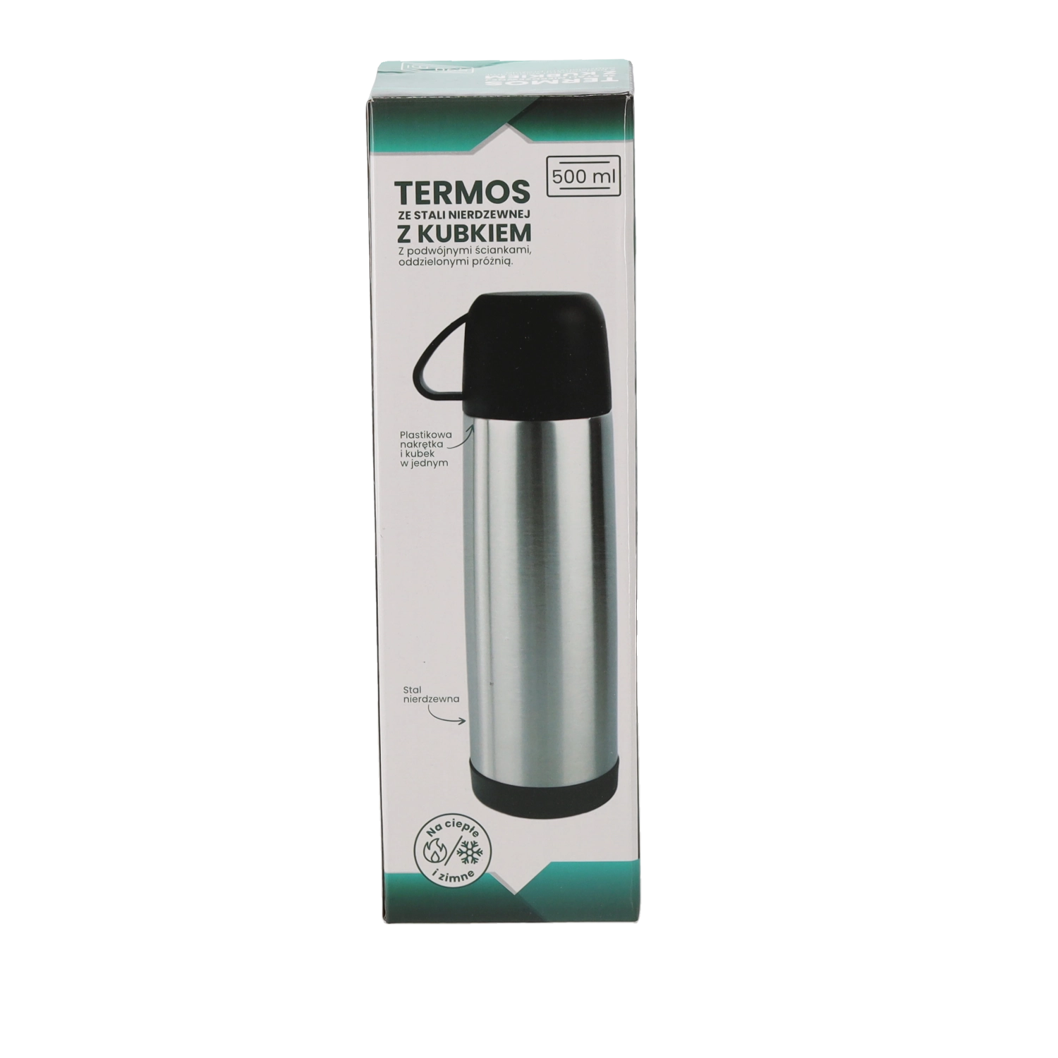 Praktischer Thermos mit Becher, 500 ml für den täglichen Gebrauch. Dank der doppelwandigen Edelstahlkonstruktion bleiben Getränke lange warm – von 96 °C auf 38–40 °C nach 24 Stunden. Inklusive robustem Kunststoffbecher für bequemes Trinken unterwegs.