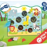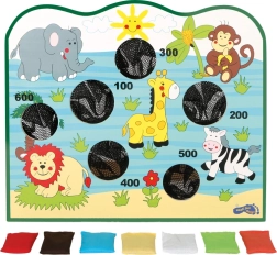 Das Spielbrett mit bunten Tierillustrationen und bunten Beuteln macht das Spiel attraktiv und unterhaltsam für Kinder.