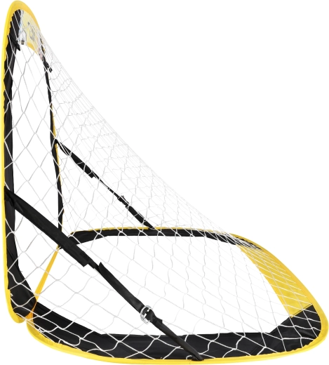 Die Konstruktion besteht aus flexiblen, zugleich robusten Glasfaserstäben, die die Form halten und Belastungen gut standhalten. Das dichte Polyesternetz ist reißfest und wetterbeständig. Für Stabilität im Gelände sind drei Metallheringe im Lieferumfang enthalten, sodass das Tor auch bei intensivem Spiel oder Wind fest steht.