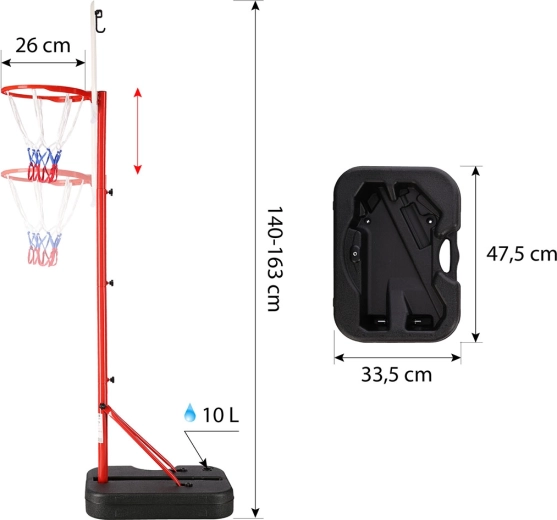 Dank der befüllbaren Basis (10 l) ist der Korb stabil und zugleich leicht versetzbar. Kompakte Brettmaße von 46,5 × 32,5 cm und das geringe Gewicht von 3,2 kg erleichtern Handhabung und Lagerung. Perfekte Ausstattung für kleine Basketballer, die ihre Treffsicherheit trainieren und ihre Fähigkeiten verbessern möchten.