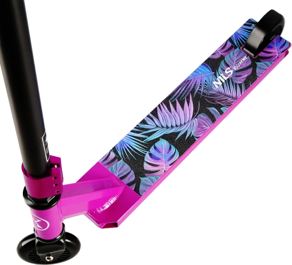 Suchen Sie einen zuverlässigen Scooter für Skatepark und Straße? Dieses Modell von NILS Extreme mit Leaves-Motiv setzt auf ein stabiles, dreikammeriges Aluminiumdeck und breite, gewindelose Lenker, die mit einer Dreischraubenklemme für maximale Steifigkeit fixiert sind. Der Verzicht auf Klappmechanismus und Höhenverstellung gewährleistet eine höhere Widerstandsfähigkeit der gesamten Konstruktion bei Tricks.