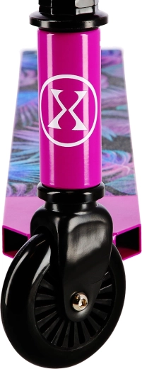 Die PU-Rollen 100 × 24 mm mit ABEC-9-Lagern bieten eine schnelle, dynamische Fahrt mit minimalem Widerstand – ideal für Asphalt und befestigte städtische Wege. Die hintere Trittbremse (Flex-Fender) sorgt für sicheres, schnelles Anhalten, während die 360°-Lenkerrotation die Möglichkeiten für Street- und Park-Riding erweitert. Gummigriffe bieten sicheren Halt und bessere Kontrolle über den Scooter.
