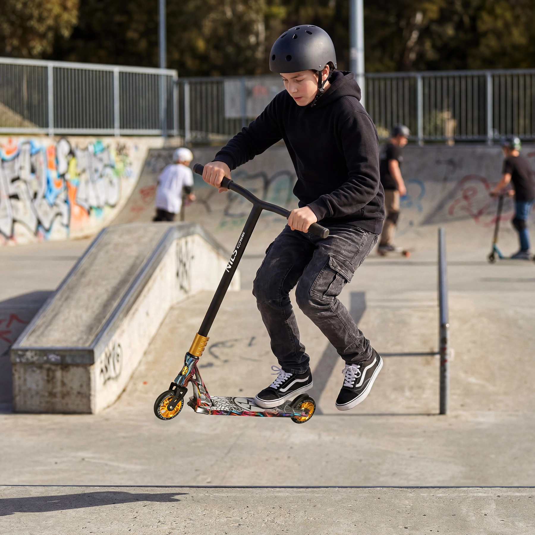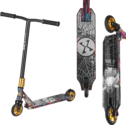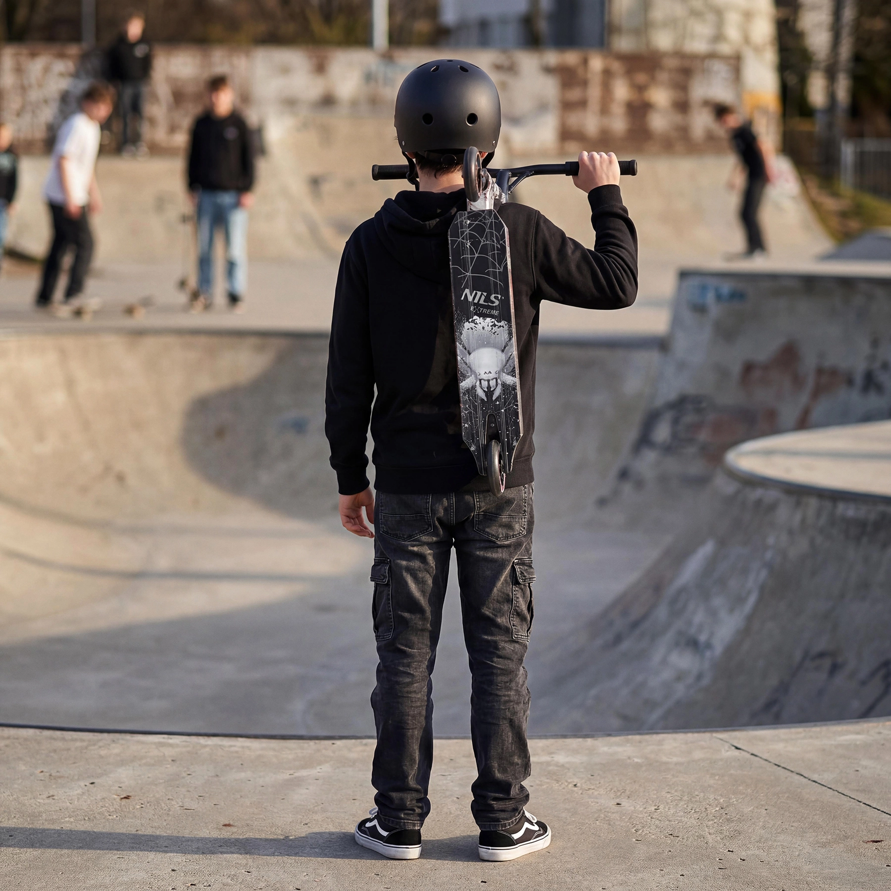 Der Roller NILS Extreme Spider HS221 ist für Tricks, Sprünge und sanfte Landungen konzipiert. Der starre Rahmen ohne Klappmechanismus erhöht die Steifigkeit, Stabilität und Lenkpräzision. Schwarze T-Bar-Lenker mit bequemen TPE-Griffen halten die Linie auch bei anspruchsvollen Tricks, während das kompakte Deck mit griffigem Grip sicheren Halt unter den Füßen bietet.
