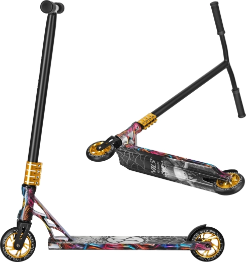 Schnelle ABEC-9-Lager und 110 × 24 mm PU-Rollen mit Aluminium-Naben sorgen für einen ruhigen, schnellen und langlebigen Lauf. Das von Street Art inspirierte Design kombiniert Spinnennetz-Grafik und kontrastierende goldene Details (Klemme, Radnaben) für einen markanten, sportlichen Auftritt.