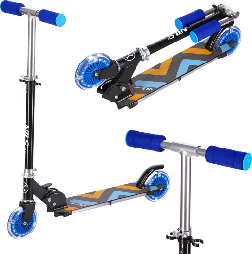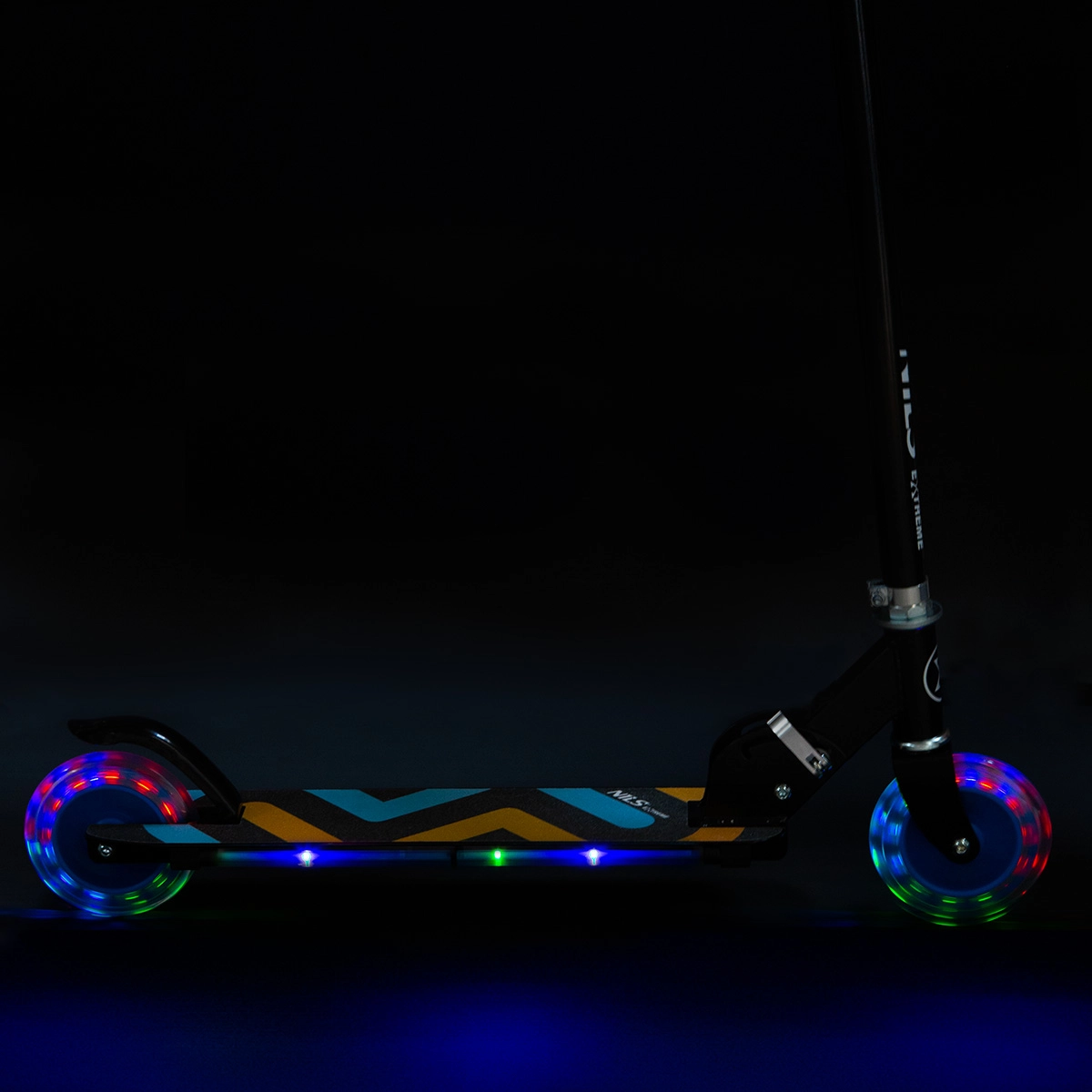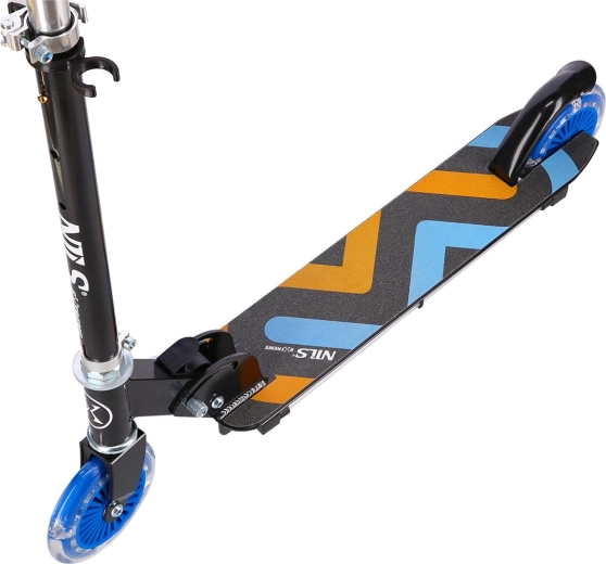 Der Roller NILS Extreme HD025 vereint modernes Design, geringes Gewicht und Sicherheit. Die Stahl-Aluminium-Konstruktion ist stabil und zugleich leicht, wodurch der Roller einfach zu tragen und zu verstauen ist. LED-Räder und beleuchtete Seitenteile des Trittbretts erhöhen die Sichtbarkeit in der Dämmerung und sorgen für einen attraktiven Effekt, den Kinder lieben.