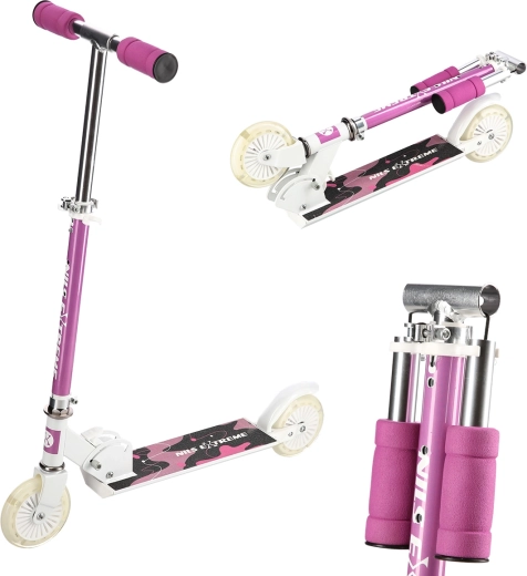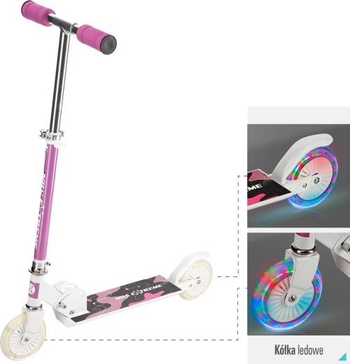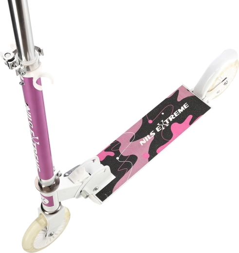 Der pinke klappbare Roller NILS Extreme HD505 ist für junge Fahrer entwickelt, die Spaß, Komfort und Sicherheit verbinden möchten. Dank der Polyurethan-Räder mit 120 mm Durchmesser ermöglicht er eine ruhige und leise Fahrt auf ebenen Flächen, während das leichte Aluminiumgehäuse und die Klappfunktion das Tragen und Verstauen erleichtern.