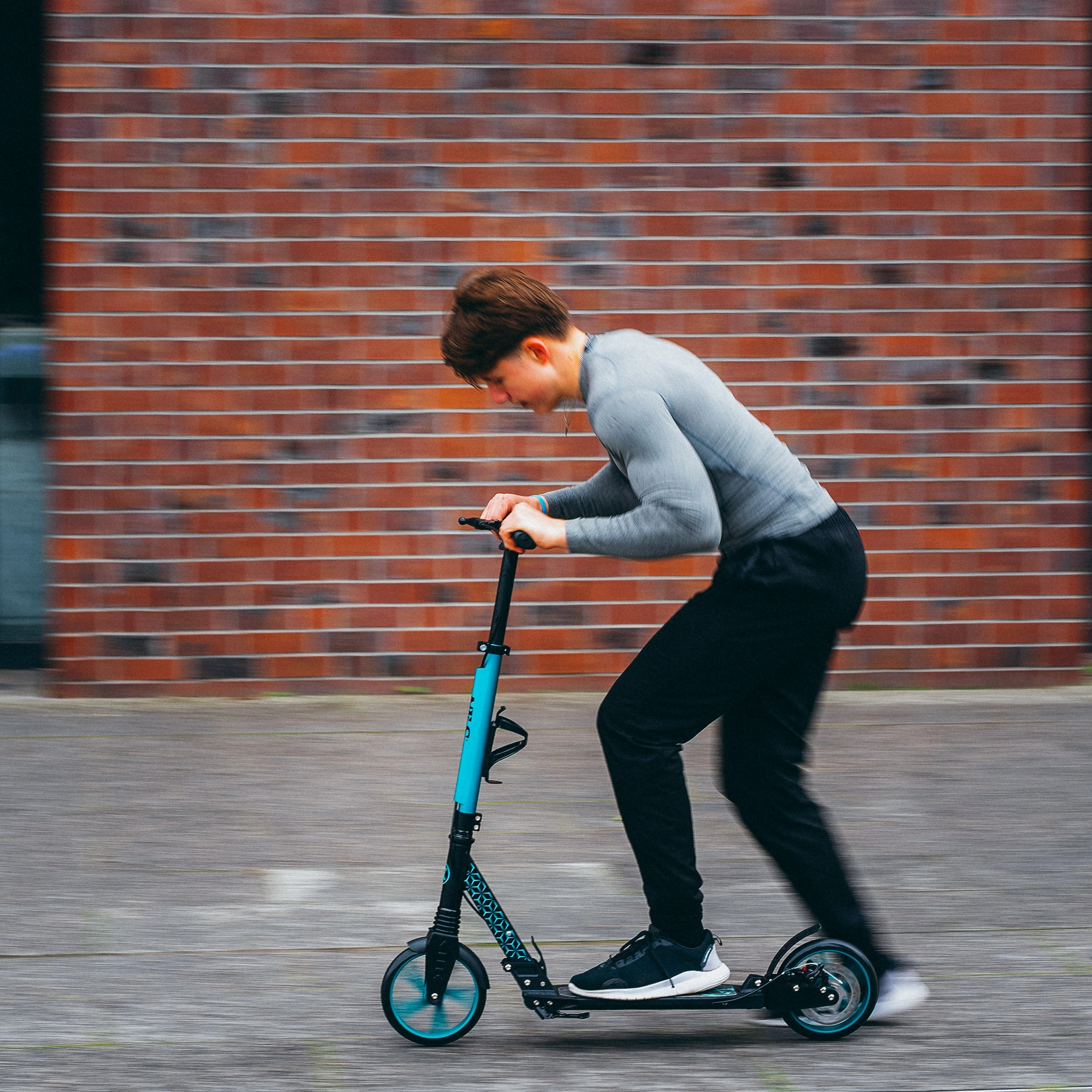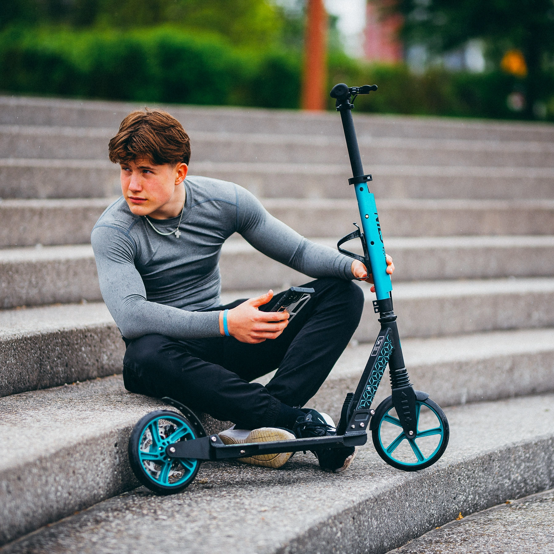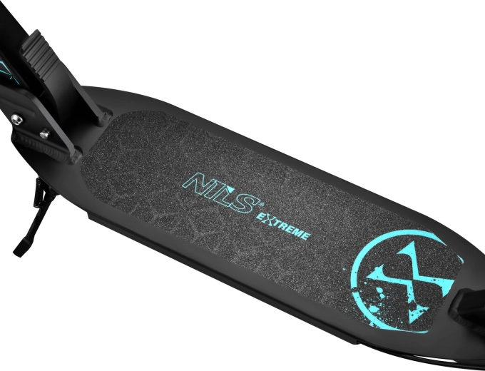 Der Scooter NILS Extreme HM124T in Türkis vereint modernes Design, Verarbeitungsqualität und Sicherheit. Dank des leichten Aluminiumrahmens lässt er sich leicht tragen und ist dennoch stabil und zuverlässig. Große Polyurethan-Räder mit 200 mm Durchmesser und präzise ABEC-7-Lager sorgen für eine sanfte und leise Fahrt auf Asphalt und befestigten Gehwegen.