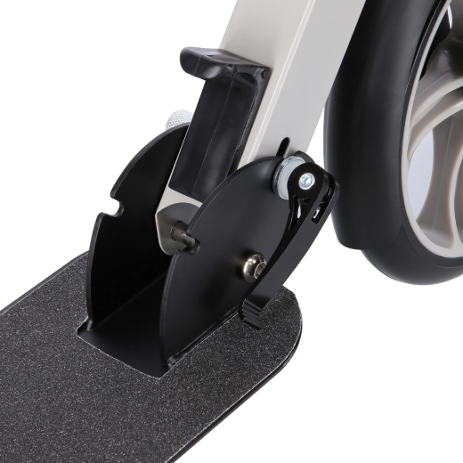 Die großen 200-mm-PU-Räder mit ABEC-7-Lagern sorgen auf Gehwegen und Radwegen für eine schnelle, leise und geschmeidige Fahrt. Verstellbare Lenker (75–95 cm) mit bequemen Gummigriffen passen sich der Körpergröße an, und die hintere Fußtrittbremse sorgt für zuverlässiges Verzögern.