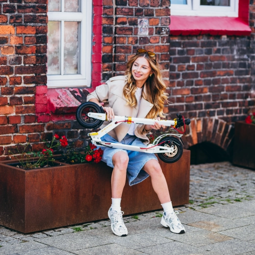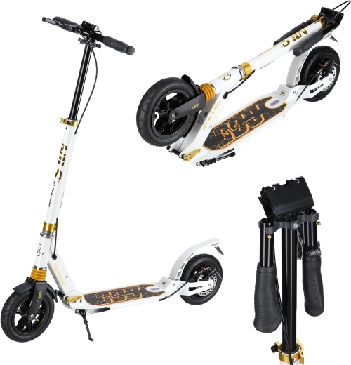 Für Ihre Sicherheit sorgen die hintere Scheiben- und Trittbremse sowie Reflektoren für bessere Sichtbarkeit. Verstellbarer Lenker (89–104 cm) und ergonomische Gummigriffe bieten Komfort für Fahrer verschiedener Körpergrößen. Dank des schnellen Klappmechanismus, der kompakten Maße im zusammengeklappten Zustand und des abnehmbaren Schultergurts sind Transport und Aufbewahrung im Handumdrehen erledigt.