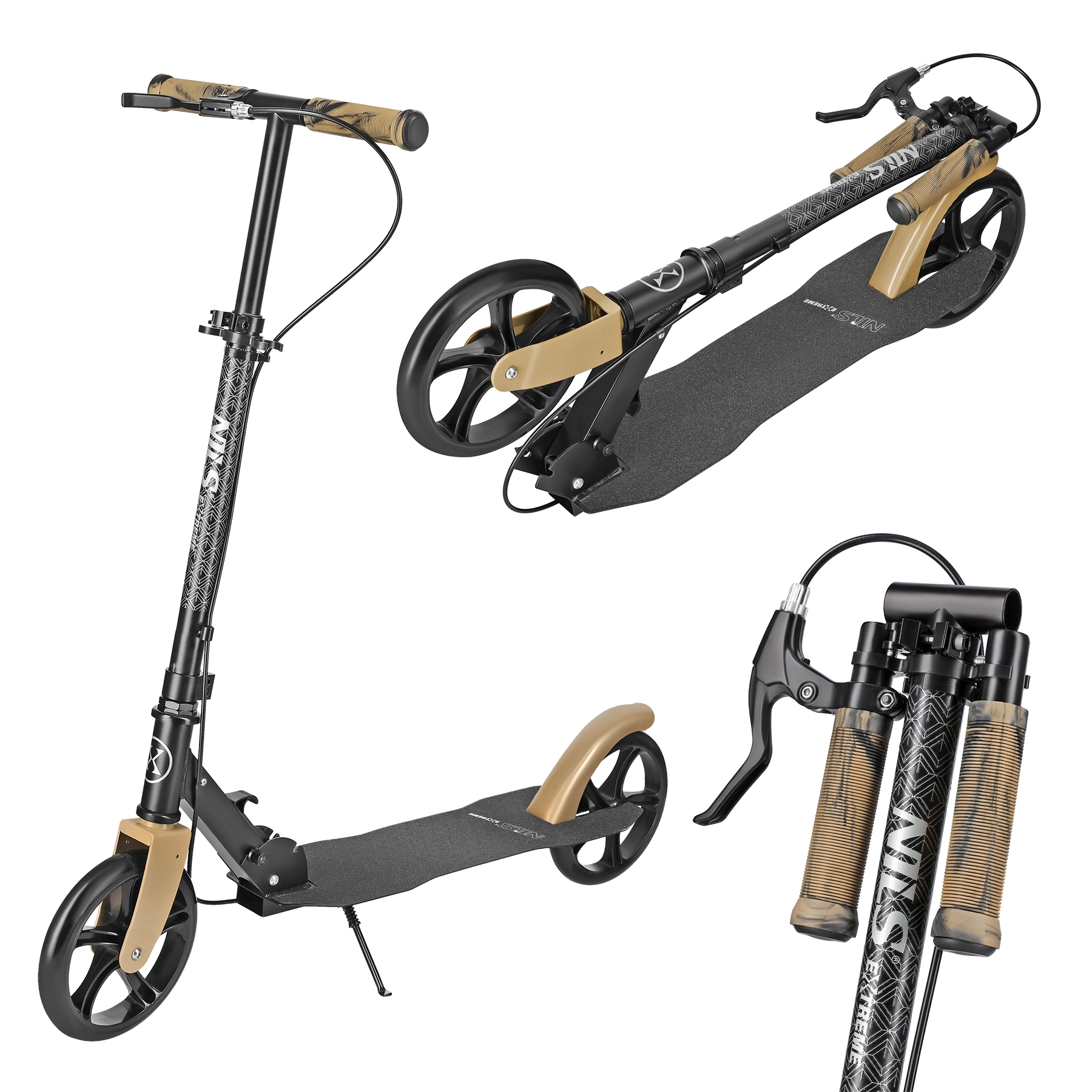 Der Tretroller NILS Extreme HM183 in eleganter Goldkombination ist die perfekte Wahl für schnelle und effiziente Fortbewegung in der Stadt. Mit seinem geringen Gewicht von 4 kg lässt er sich leicht in den ÖPNV oder ins Büro mitnehmen, während der robuste Rahmen aus Aluminium und Stahl lange Lebensdauer und Zuverlässigkeit im täglichen Einsatz bietet. Die großen 200-mm-PU-Räder mit ABEC-7-Lagern garantieren eine leise, sanfte und stabile Fahrt auf Asphalt und Pflaster.