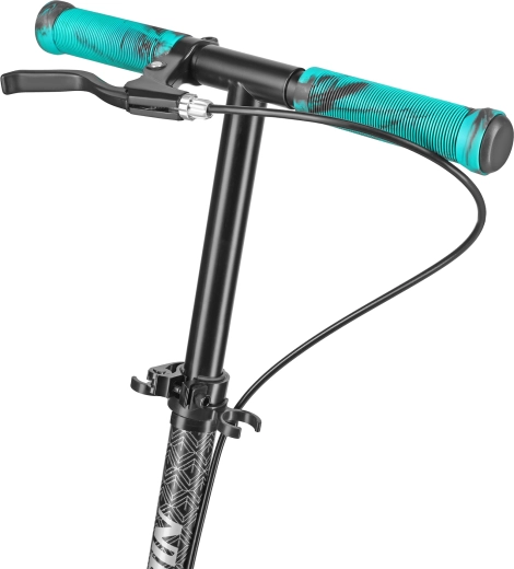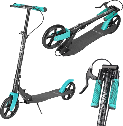 Der Lenker mit weichen TPR-Griffen ist in drei Stufen einstellbar (87 / 92 / 97 cm), sodass Sie den Scooter Ihrer Körpergröße anpassen können. Die Sicherheit erhöht eine Handbremse, ergänzt durch eine hintere Trittbremse, während der integrierte Ständer das Abstellen im Tagesverlauf erleichtert.