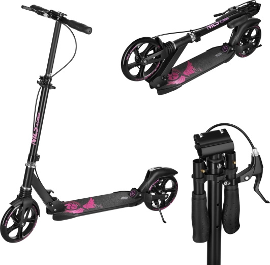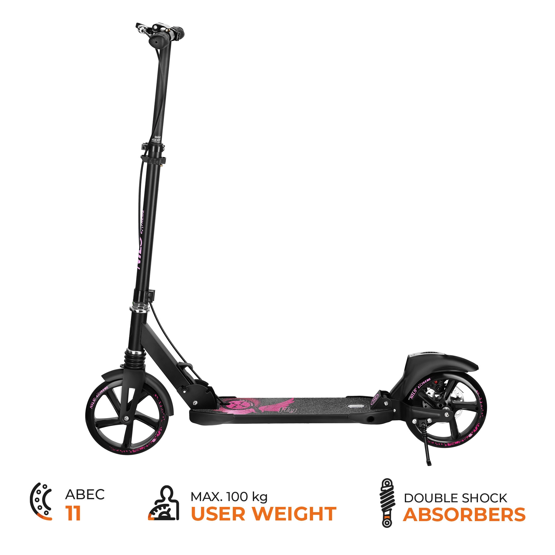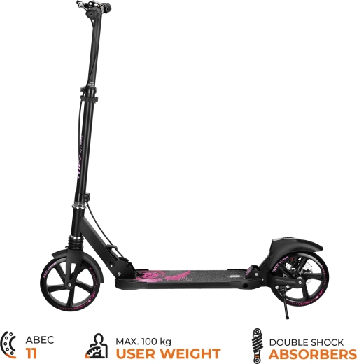 Entdecken Sie eine leichte und stabile Fahrt mit dem NILS EXTREME Fly Scooter. Dank der großen 200‑mm-Räder, ABEC‑11-Lagern und Federungen vorne und hinten genießen Sie ein sanftes Gleiten über Asphalt, Gehwege und Pflaster. Die widerstandsfähige Kombination aus Stahl und Aluminium sorgt für Langlebigkeit, während die Klappkonstruktion und der Ständer den Alltagseinsatz erleichtern.