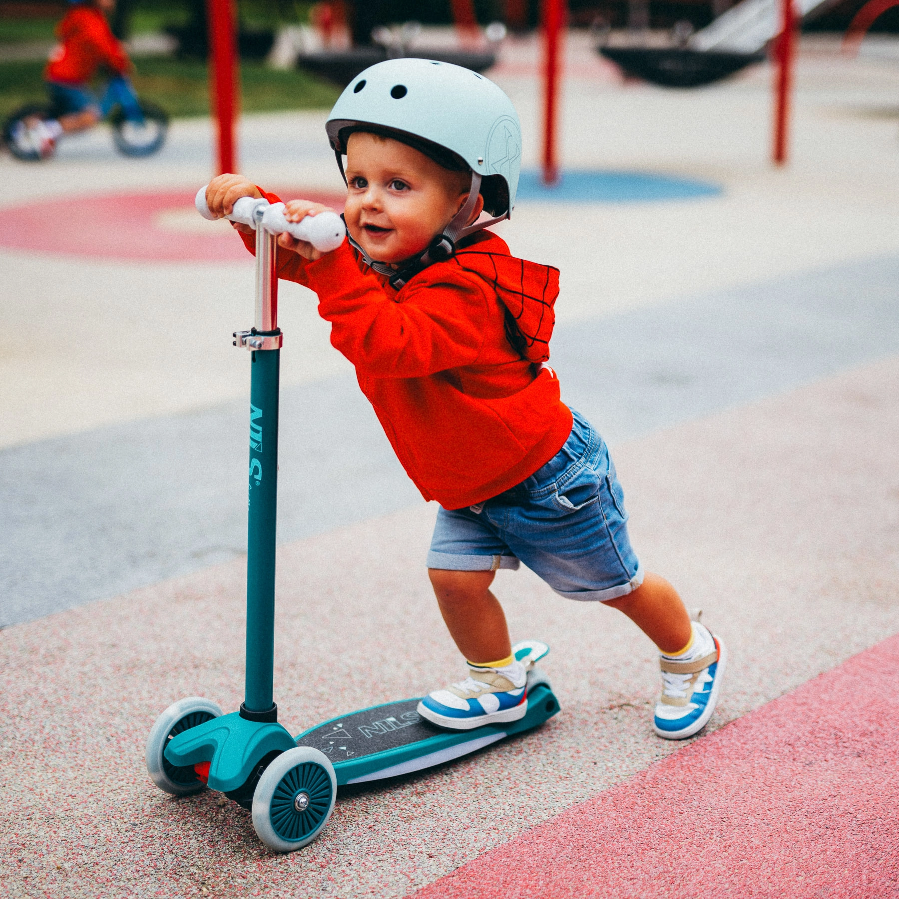 Zwei Vorderräder und die kippbare Lenkung helfen Kindern, sicher zu lenken, ohne den Lenker zu überdrehen. Das breite Deck und die Hinterradbremse erhöhen die Kontrolle während der Fahrt.