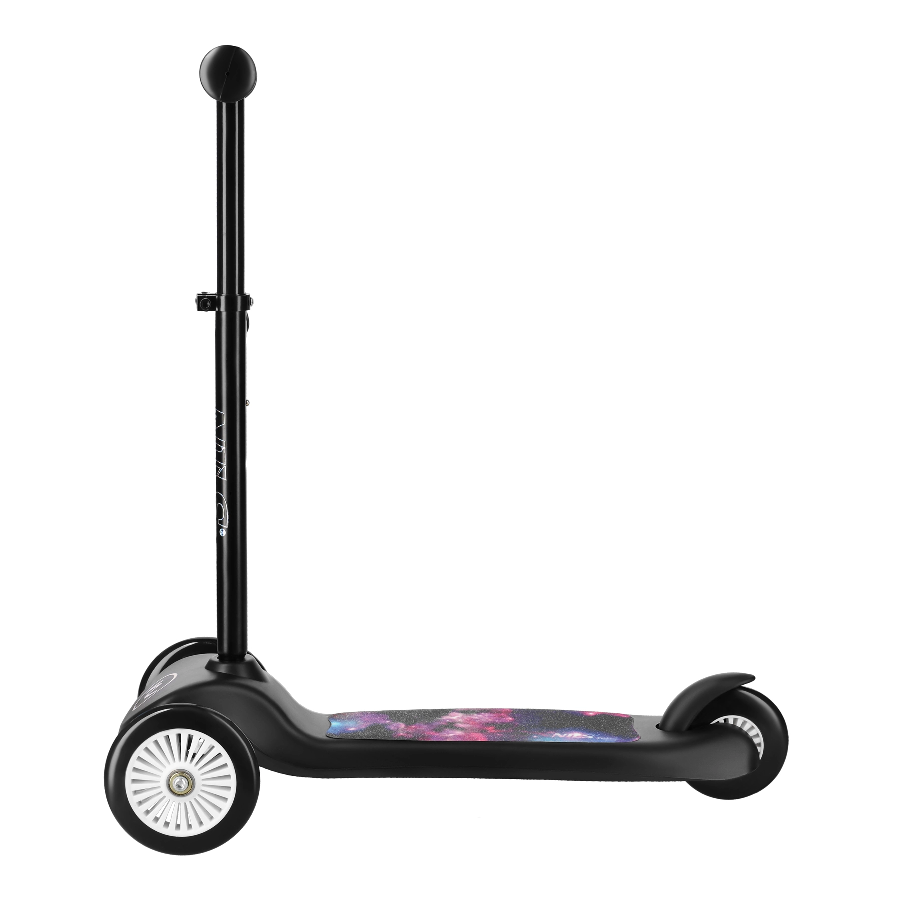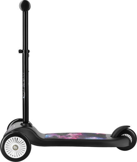 Ein Deck mit attraktivem Galaxie-Motiv, Räder aus robustem PVC und ABEC-5-Lager bieten eine ruhige, geschmeidige Fahrt auf Gehwegen und leicht unebenem Untergrund. Die robuste Konstruktion aus PP, Aluminium und Stahl trägt bis zu 50 kg, sodass der Roller den Kindern jahrelang erhalten bleibt. Mit einem Gewicht von nur 2,1 kg kann er leicht von Kindern und Eltern getragen werden.