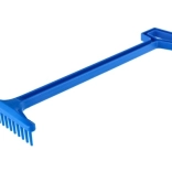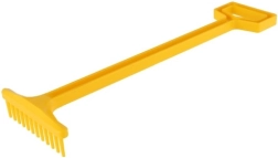 Der lange Stiel und das geformte Ende sorgen für einen stabilen Griff beim Harken von Sand und Laub.