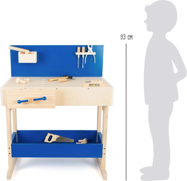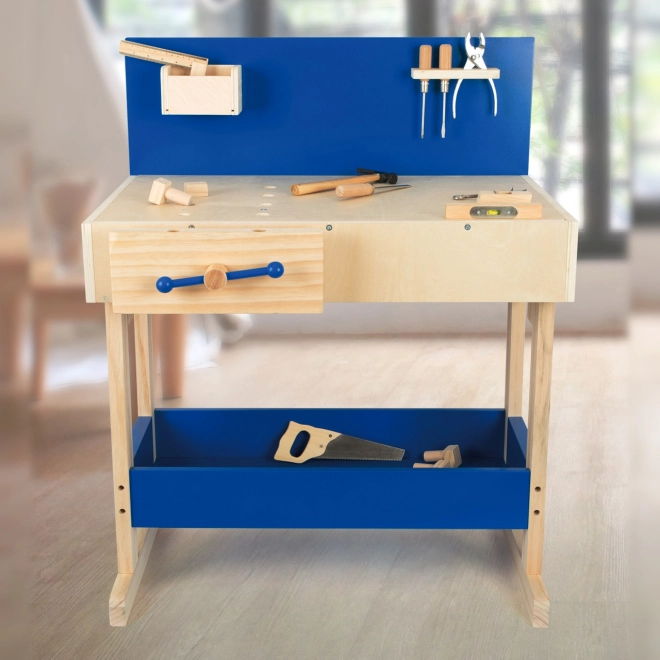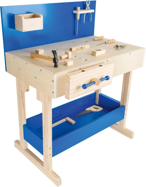 Die Holzwerkbank bietet Kindern die Möglichkeit, echte Arbeiten mit Werkzeug zu imitieren und dabei ihre Feinmotorik und Vorstellungskraft zu entwickeln. Die Werkbank ist mit verschiedenen Werkzeugen wie einer Säge und einem Hammer ausgestattet.