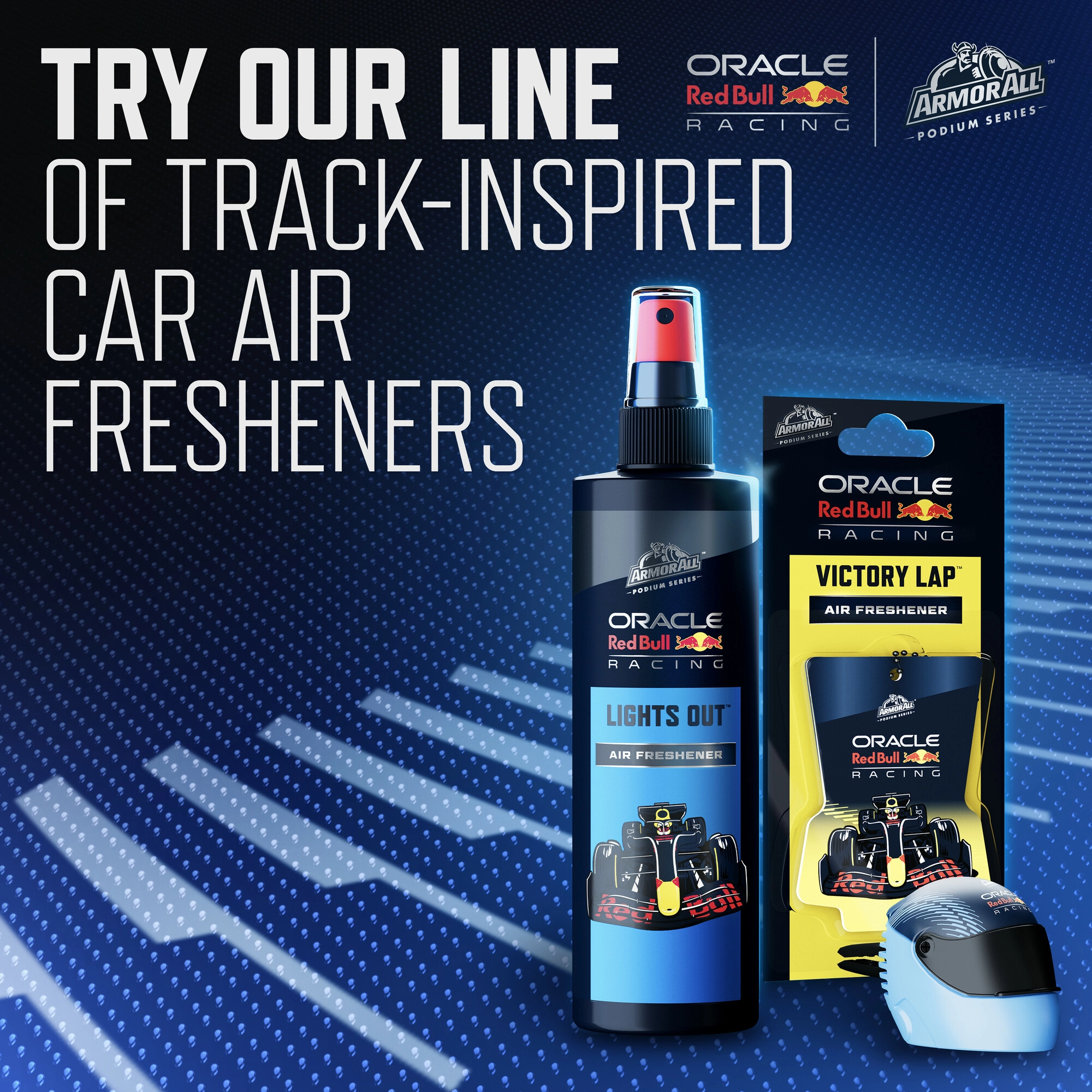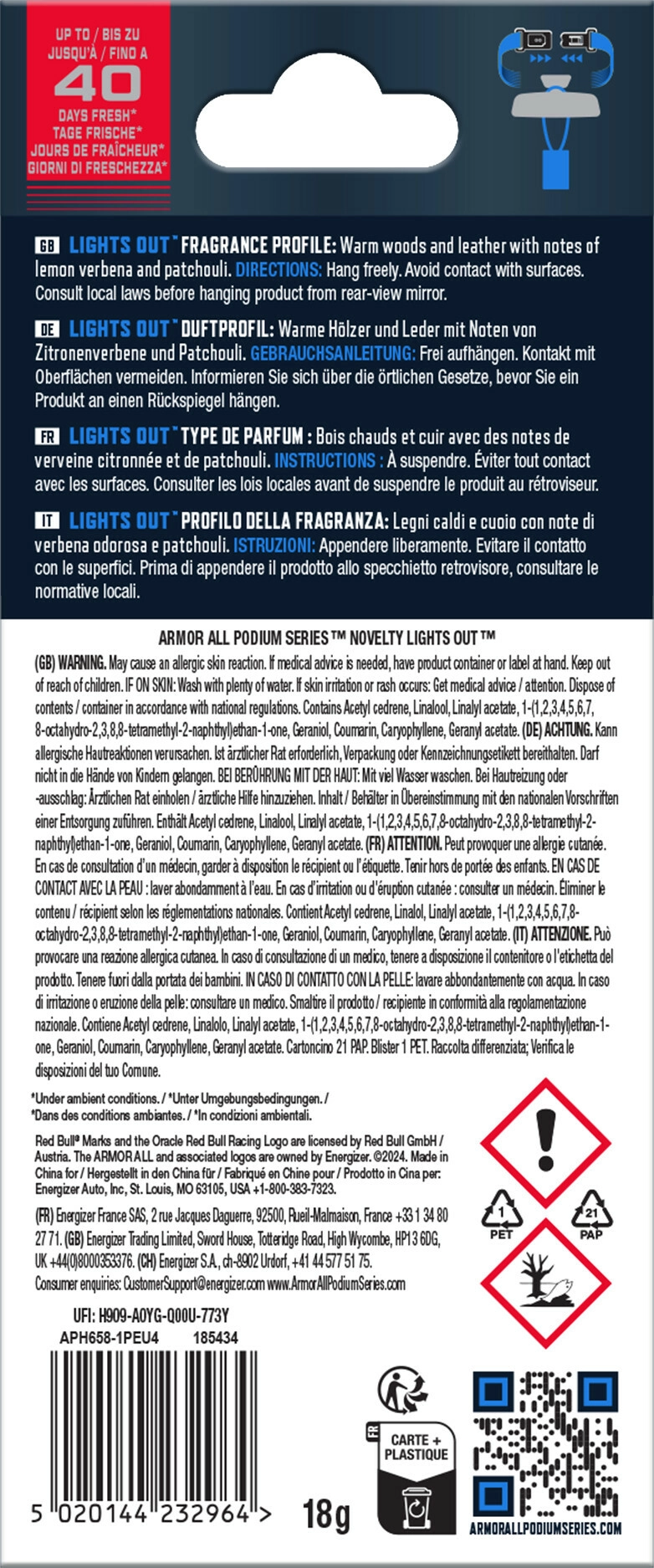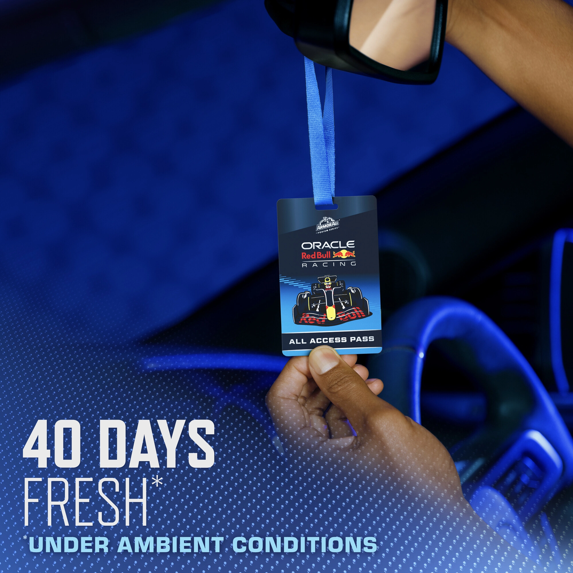 Schaffen Sie eine angenehme Atmosphäre im Fahrzeuginnenraum mit einem Duft, der an die Welt der Geschwindigkeit und Präzision erinnert. Dieser hängende Lufterfrischer Armor All Oracle Red Bull Lights Out – All Access Pass wurde in Zusammenarbeit mit Oracle Red Bull Racing entwickelt und überzeugt nicht nur optisch, sondern auch durch eine ausgewogene Duftkomposition.