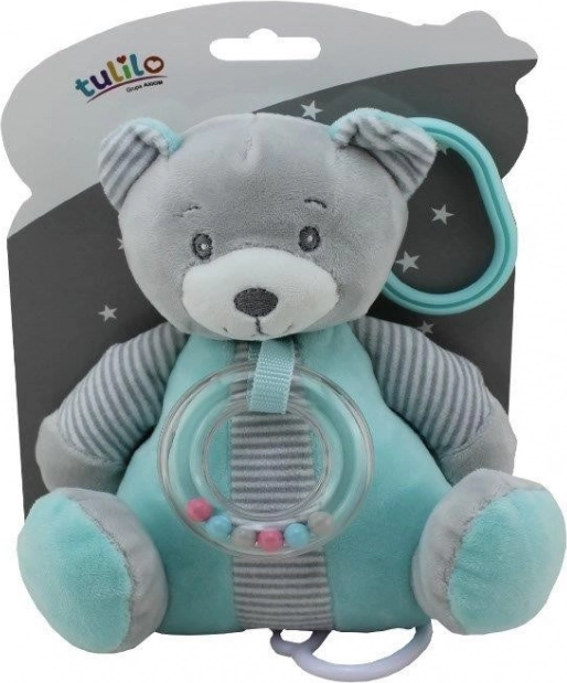 Die interaktive Rassel, die am Hals des Bären angebracht ist, erzeugt beim Bewegen Geräusche, die das Hörvermögen stimulieren.