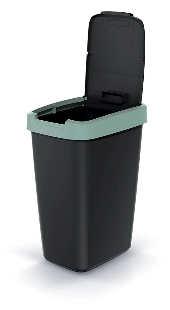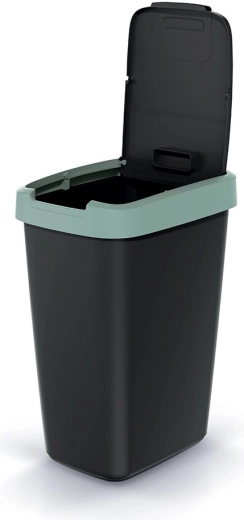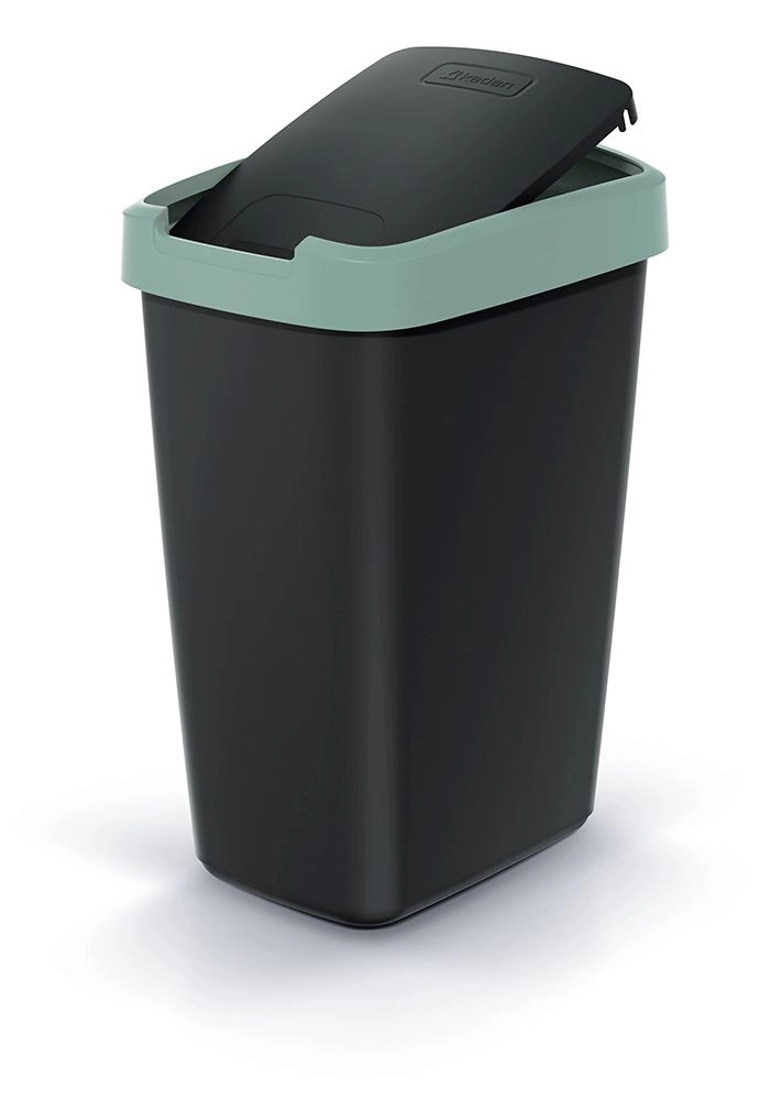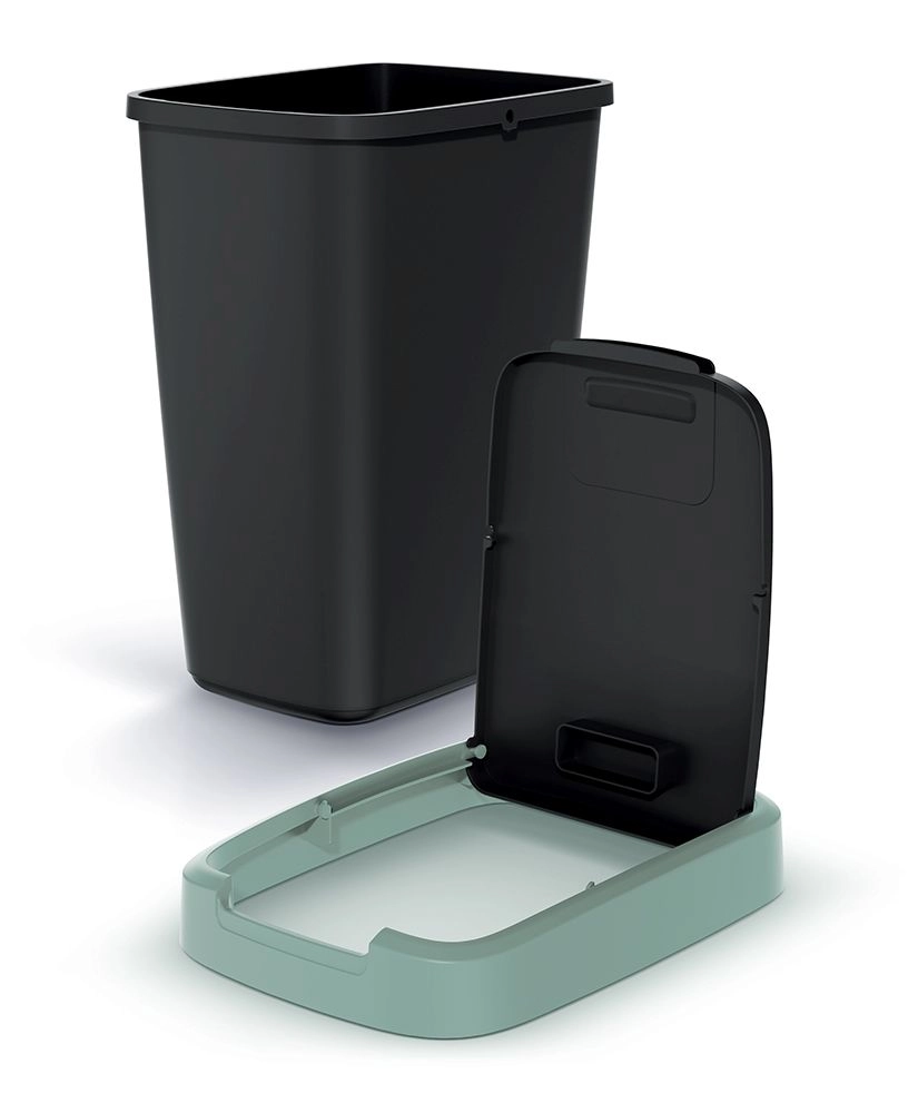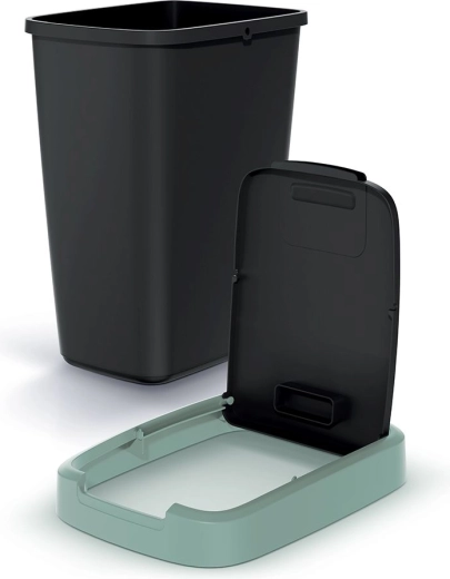 Robuster Kunststoff mit matter Oberfläche ist leicht zu reinigen, und die elegante Schwarz–Mint-Farbkombination passt in moderne Interieurs. Dank der rechteckigen, leicht konischen Form spart der Eimer Platz und bleibt auch in schmaleren Bereichen stabil.