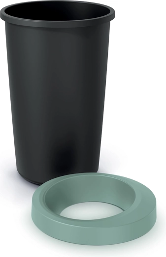 Der Korpus aus recyceltem schwarzem Kunststoff ist robust und leicht, was die Handhabung und den Transport erleichtert. Der hellgrüne Deckel unterstützt übersichtliche Mülltrennung und setzt einen frischen Akzent im Raum.