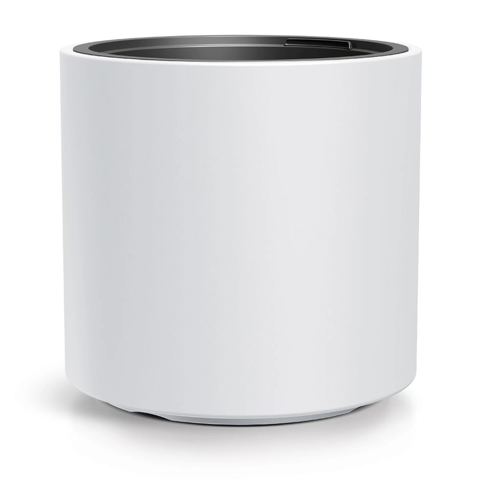 Klare zylindrische Linien und eine matte weiße Oberfläche fügen sich mühelos in moderne wie klassische Umgebungen ein – vom Wohnzimmer bis zur Terrasse.