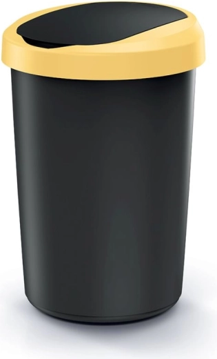 Der Korpus besteht aus recyceltem schwarzem Kunststoff, der widerstandsfähig gegen mechanische Beschädigungen ist und sich leicht reinigen lässt – die Oberfläche kann einfach mit einem feuchten Tuch abgewischt werden. Der hellgelbe Deckel unterstützt eine übersichtliche Abfalltrennung und verleiht zugleich ein modernes Erscheinungsbild.