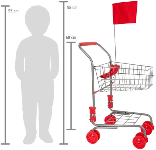 Der silberfarbene Kinder-Einkaufswagen SMALL FOOT im realistischen Design überzeugt mit einem stabilen Metallrahmen, roten Akzenten und einer Sicherheitsfähnchen. Dank der schwenkbaren Vorderräder lässt sich der Wagen auch in kleineren Räumen leicht manövrieren, sodass Kinder bequem „einkaufen“ können wie ihre Eltern.