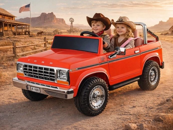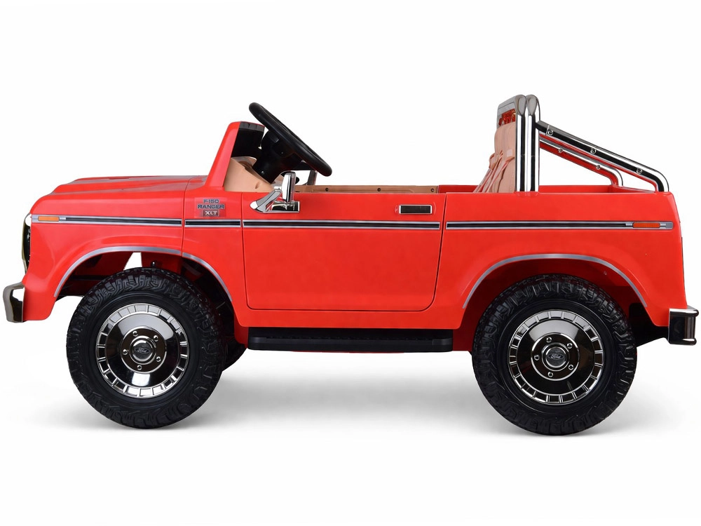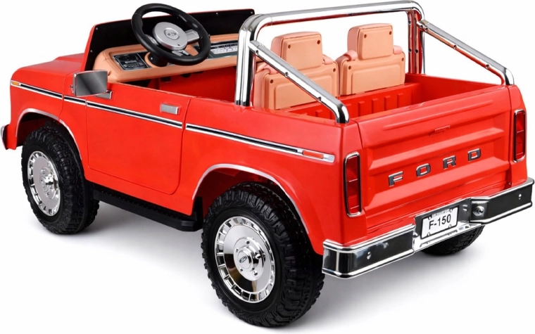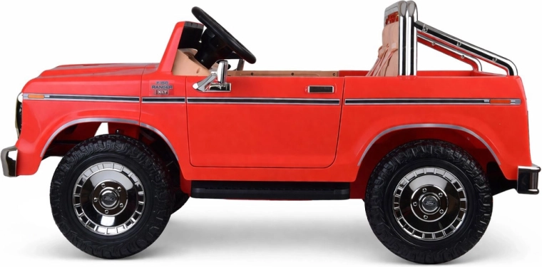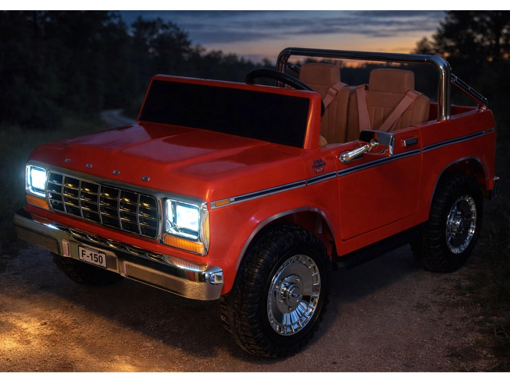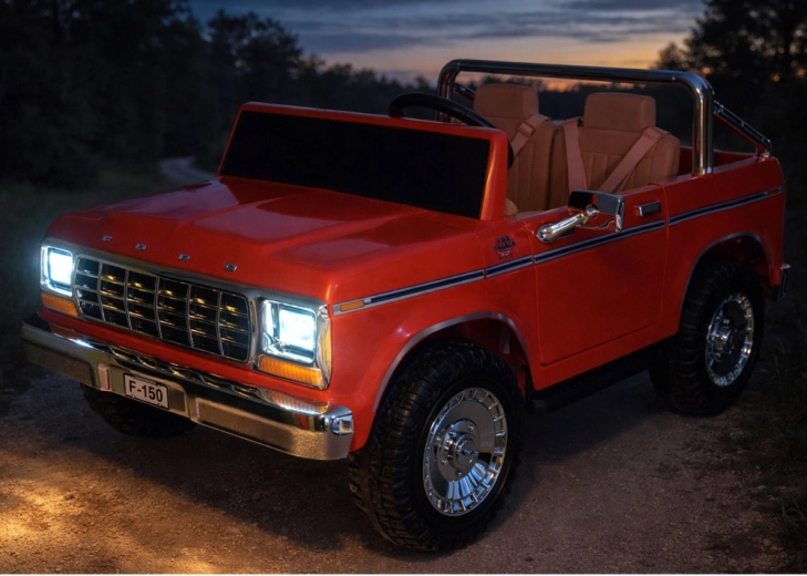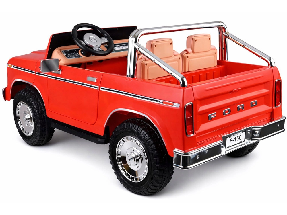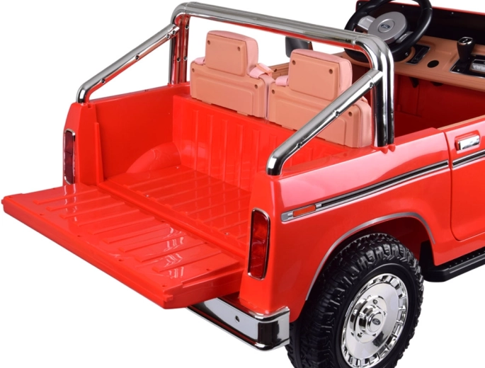 Der stylische Kinder-Pickup, inspiriert vom Klassiker FORD Bronco, überzeugt mit seiner kantigen Silhouette, verchromten Details und realistischer Ausführung. Die bequeme Zweisitzer-Kabine mit ergonomischem Cockpit, gut ablesbarem Batteriestatusanzeiger und öffnender Heckladefläche fördert kreatives Spiel und längere Ausfahrten.