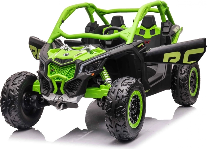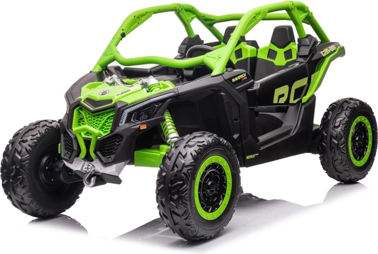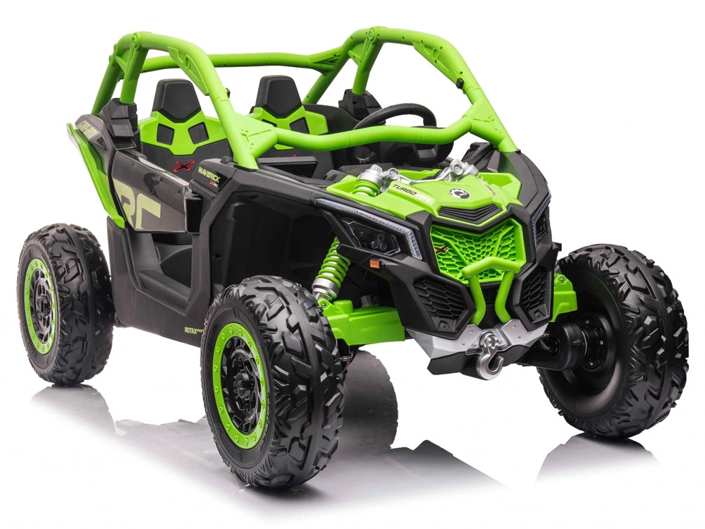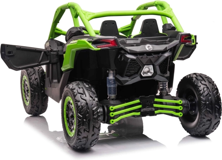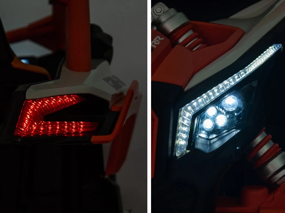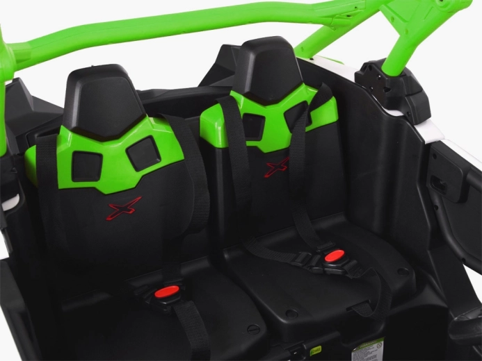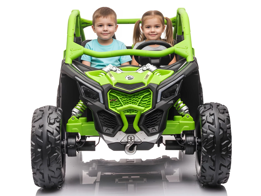 Für Unterhaltung sorgt ein Multimedia‑Panel mit USB, microSD‑Slot und MP3‑Eingang. Außerdem vorhanden: Start/Stop‑Taste mit Motorstart‑Sound, LED‑Lichter vorne und hinten sowie Sicherheits‑Gurte. Öffnende Türen erleichtern das Einsteigen, und die hohe Bodenfreiheit verleiht dem Fahrzeug den echten Offroad‑Look.