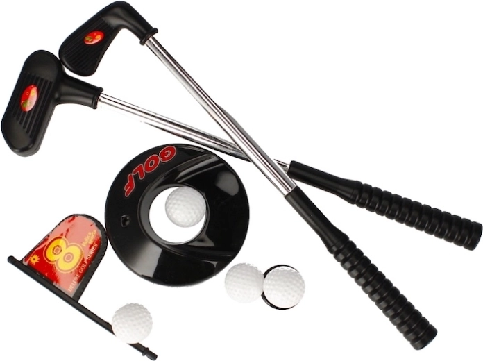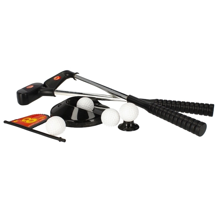 Im Set enthalten: 2 Schläger, 3 Bälle, Loch mit Fähnchen und Rampe/Ziel – einfach auspacken und drinnen oder draußen loslegen.