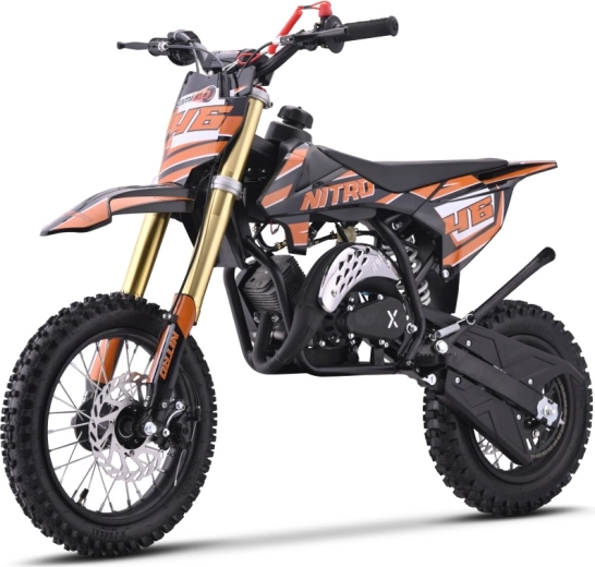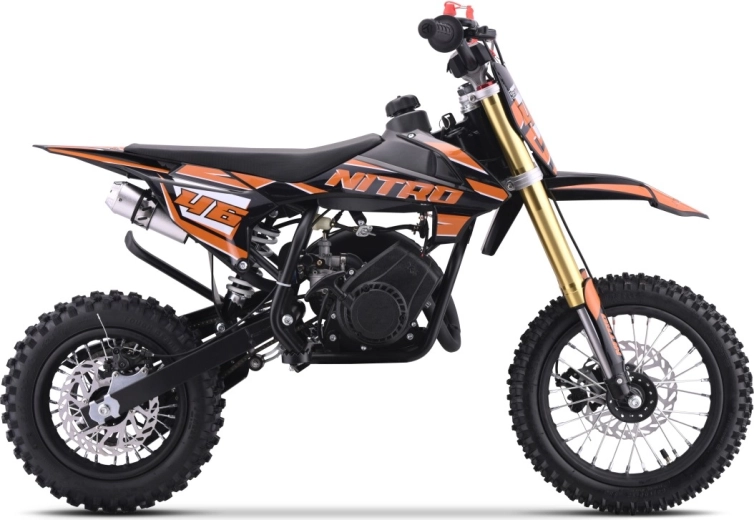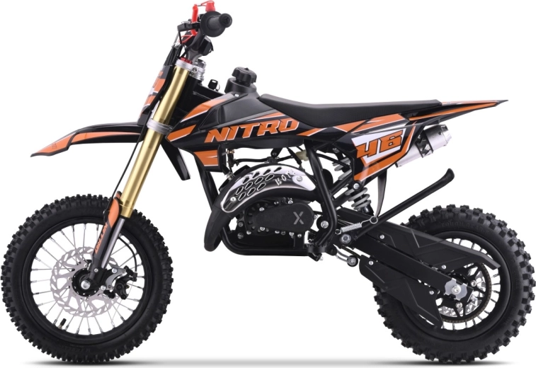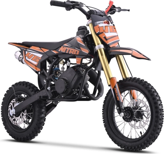 Das Minicross NITRO 60cc basiert auf einem pulverbeschichteten Stahlrahmen mit verstärkter hinterer Schwinge. Der einzylindrige Zweitaktmotor mit 60 cm³ und konischem Luftfilter sorgt für lebhaften Anzug, einfache Wartung und zuverlässigen Betrieb. Der Handstarter ermöglicht ein schnelles Starten überall.