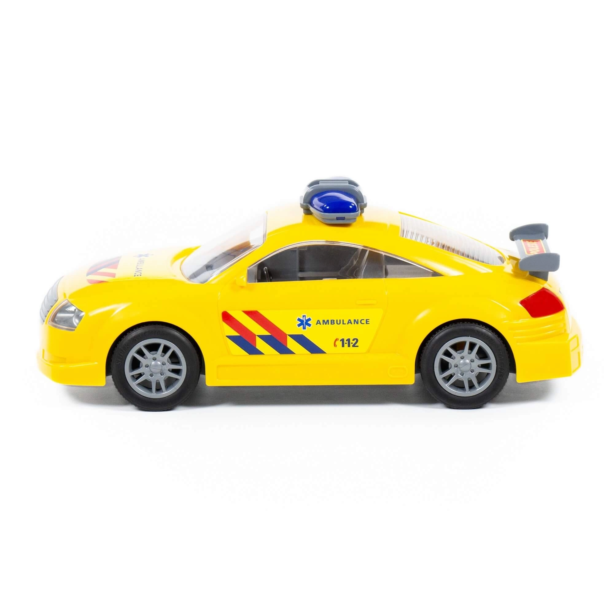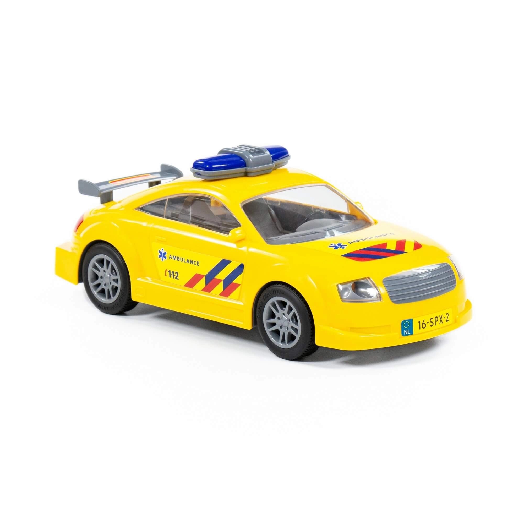 Dieses gelbe Ambulanzauto mit sportlichem Design, transparenten Fenstern und blauem Blaulicht ist ideal für kleine Retter. Dank des Schwungantriebs genügt ein leichter Schubs – das Fahrzeug fährt los und lädt zu weiteren Aktionen und Geschichten ein.