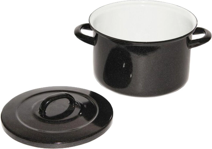 Entdecken Sie die zeitlose Qualität von Emaille mit dem Topf BELIS Standard. Die schwarze Oberfläche mit weißer Sprenkelung und das helle Innere im Stil von weißem Granit verleihen Ihrer Küche einen klassischen Look, während der massige Korpus (1–1,2 mm) für gleichmäßige Wärmeverteilung und energiesparendes Kochen sorgt. Dank der glatten Oberfläche ist die Pflege einfach und schnell.